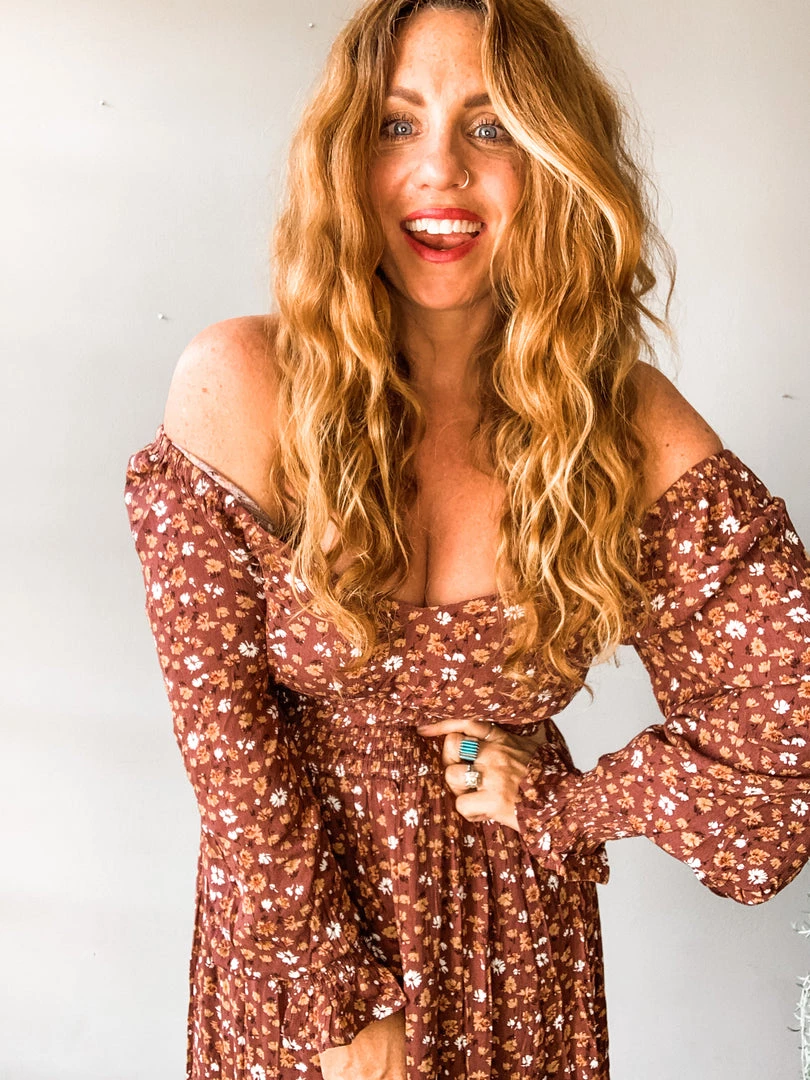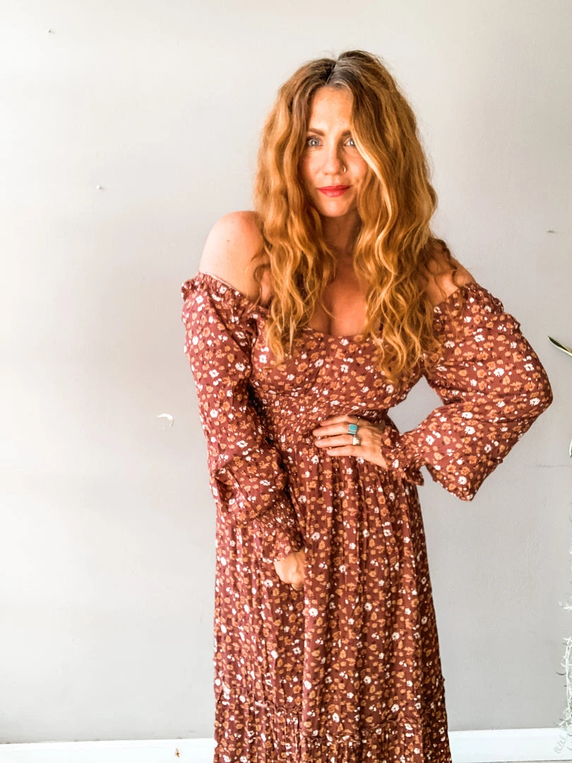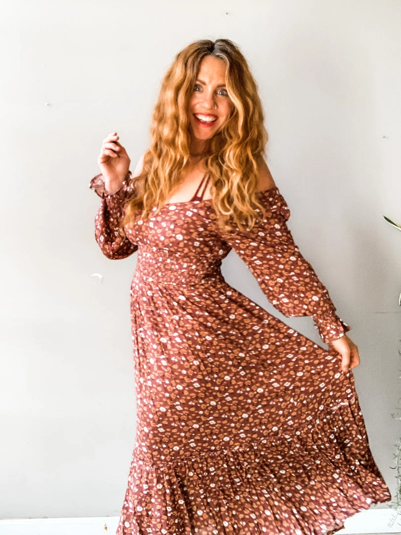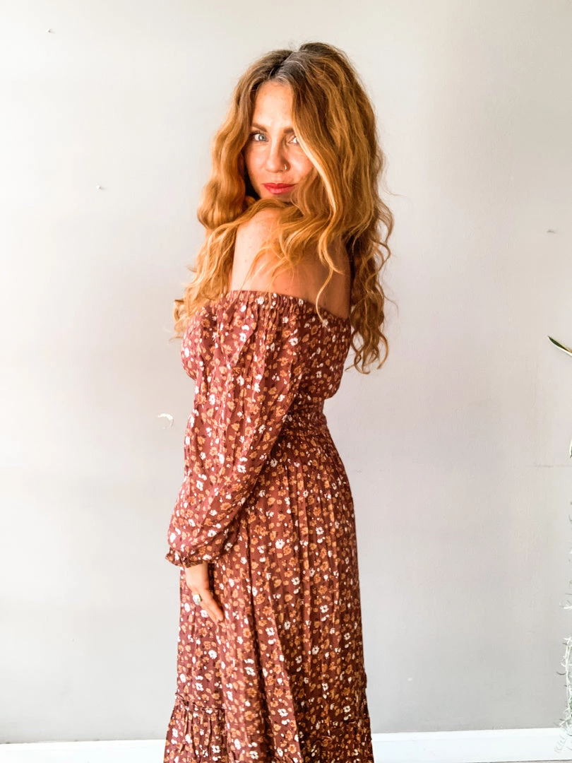 The Viv Floral Midi Dress is a gorgeous silhouette with so many fun details! A long sleeve that can be worn on or off the shoulder with a fitted smocked waist, fun peasant-style sleeve and mid lenghth. Double lined.