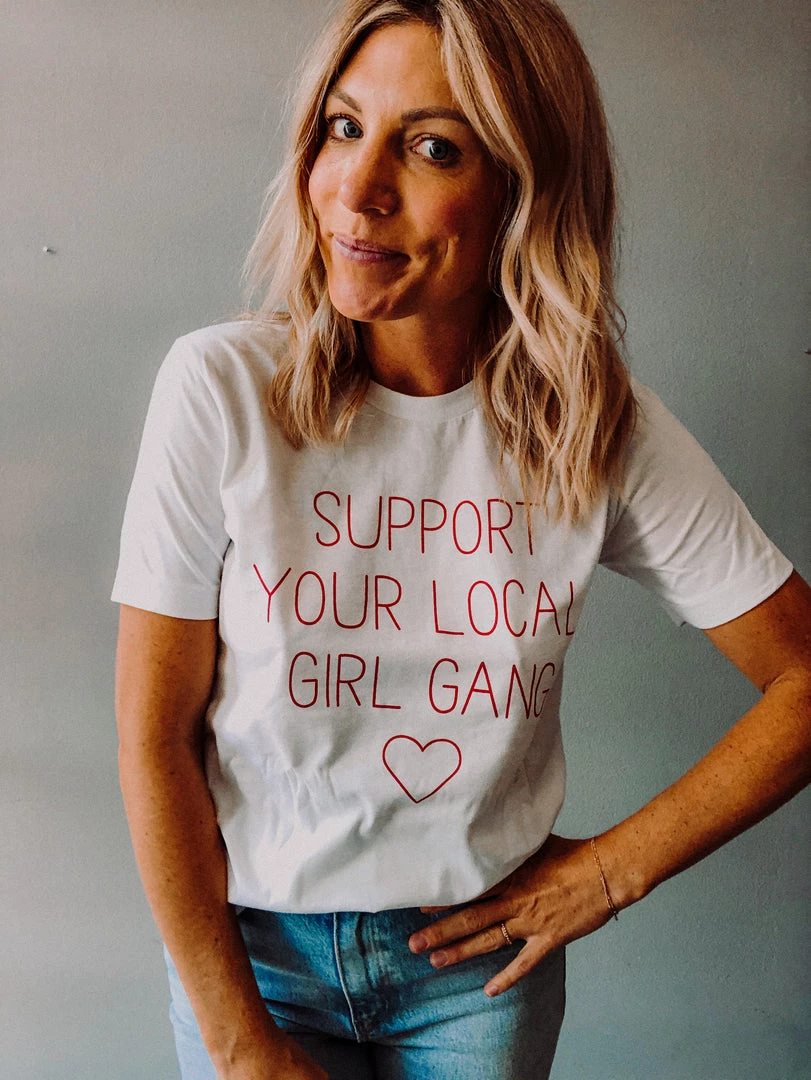 Words to live and breath by. Support your local girl gang graphic tee with red font. Size up for looser fit.