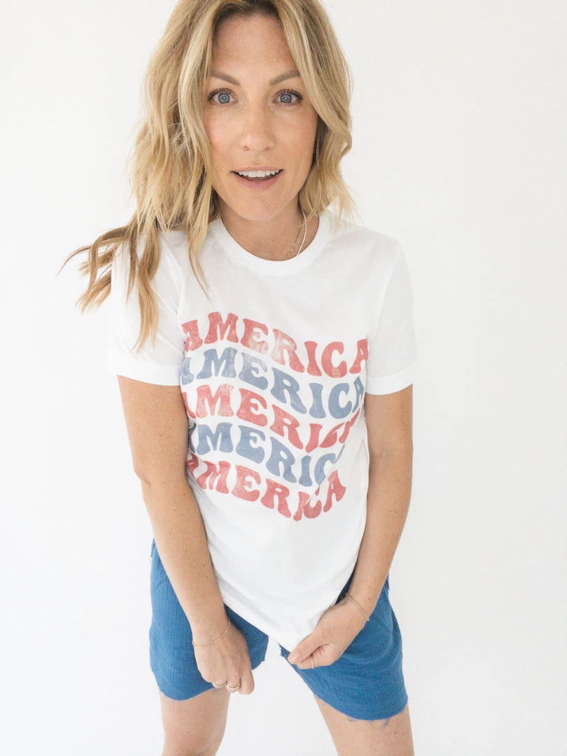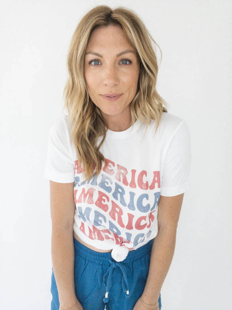 A red and blue America graphic on a white crew neck tee. A fav for 4th of July or any day you choose to celebrate the USA. Super cute worn tied up or tucked with your fav cutoffs or tossed over a swimsuit.