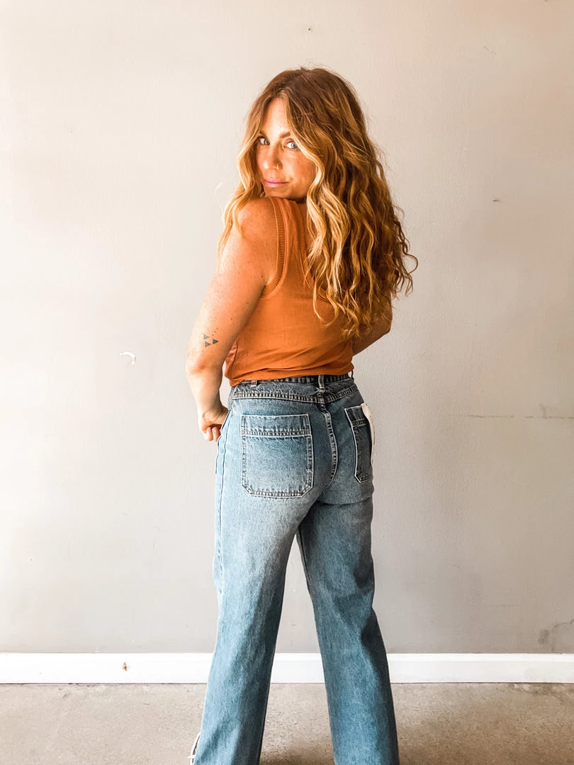 We are OBSESSED with the new Brooke Denim Pant!!! This high waisted straight leg denim has super flattering pocket placement and a great structured fit, while still being comfy to move around in! We love the casual vibes of these old school feeling denim jeans.