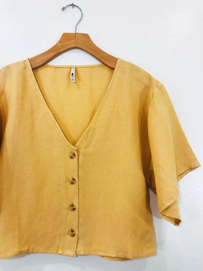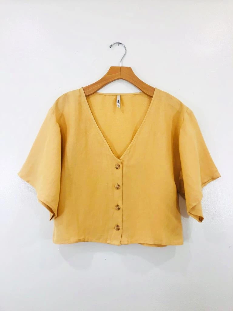 Raise your hand if you’re ready for some sunshine! You raised your hand didn’t you?? We feel you girl! The Bungalow woven is a short sleeve crop with half bell sleeves and button front. Pairs well with high waisted denim.