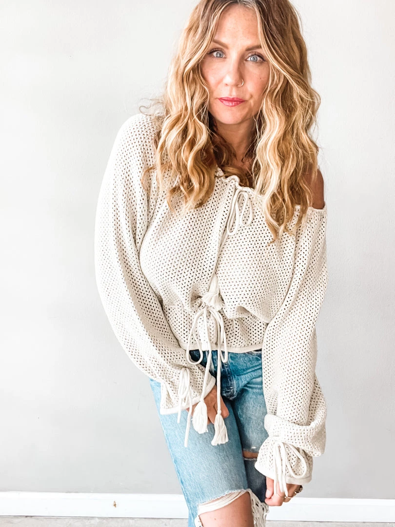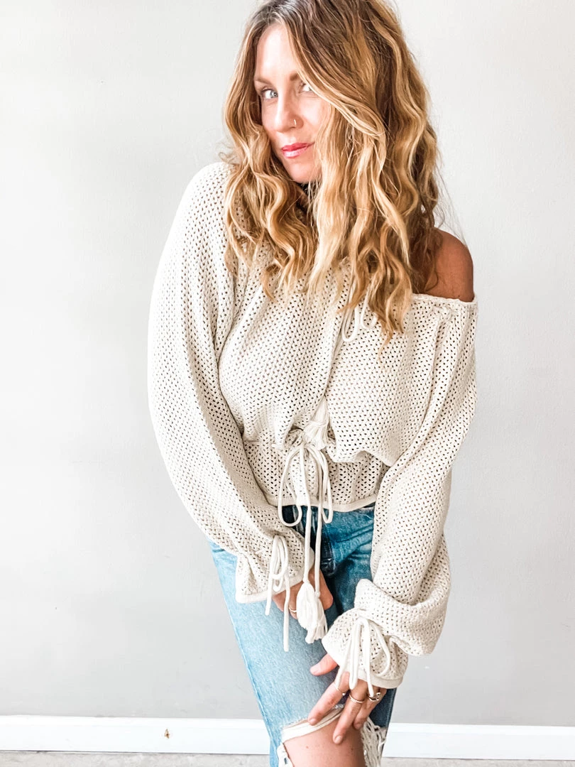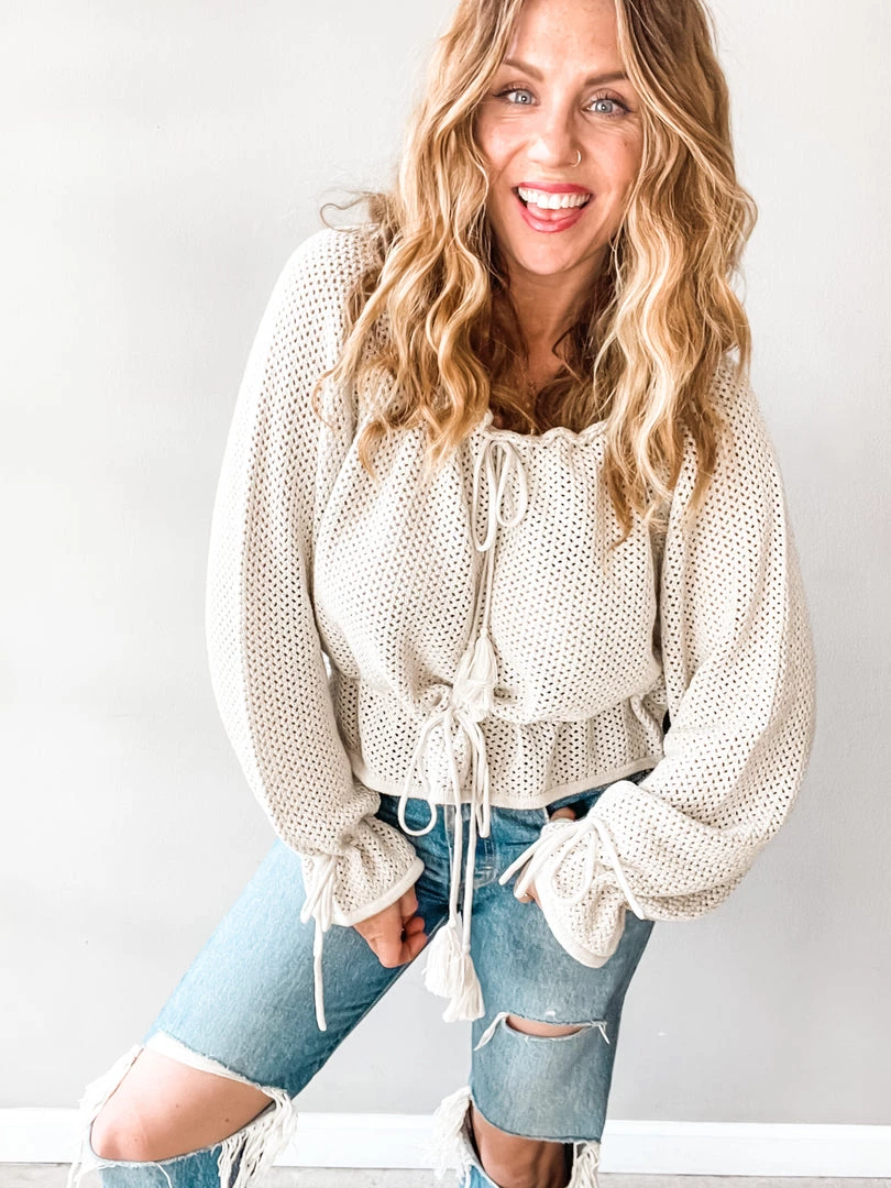 The Turpel Knit Sweater is a super fun open knit sweater with cute little woven tie details at the waist and sleeves. Wear it scrunched up for a more fitted and cropped look, or loose and flowy for a chic and relaxed vibe!!! A great neutral linen colorway for any outfit!