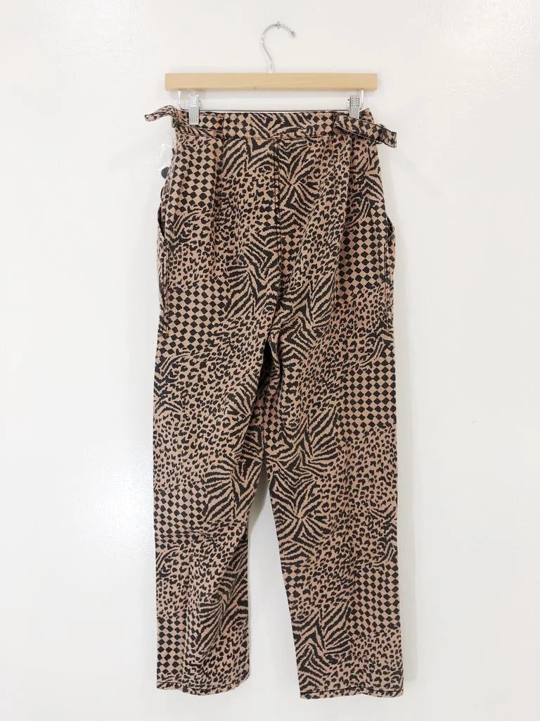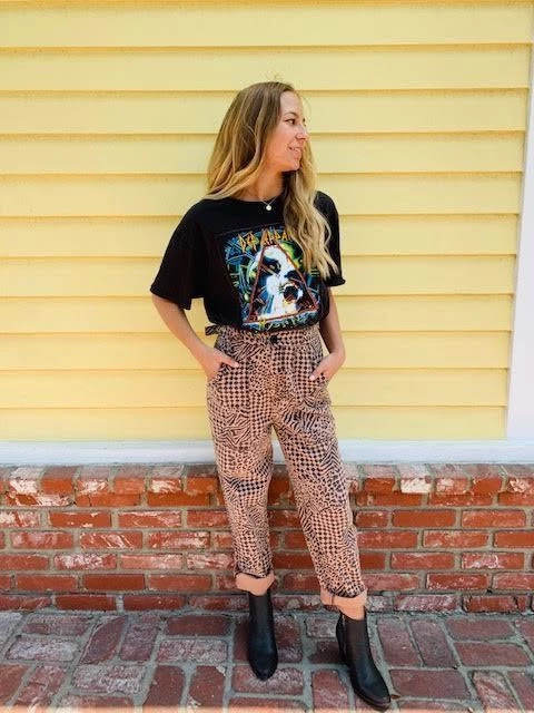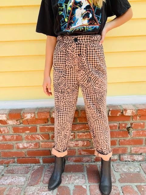 A must. High waisted all over print pants with side pockets and buckle detail. A great statement pant that looks great with a bodysuit or graphic tee and booties.