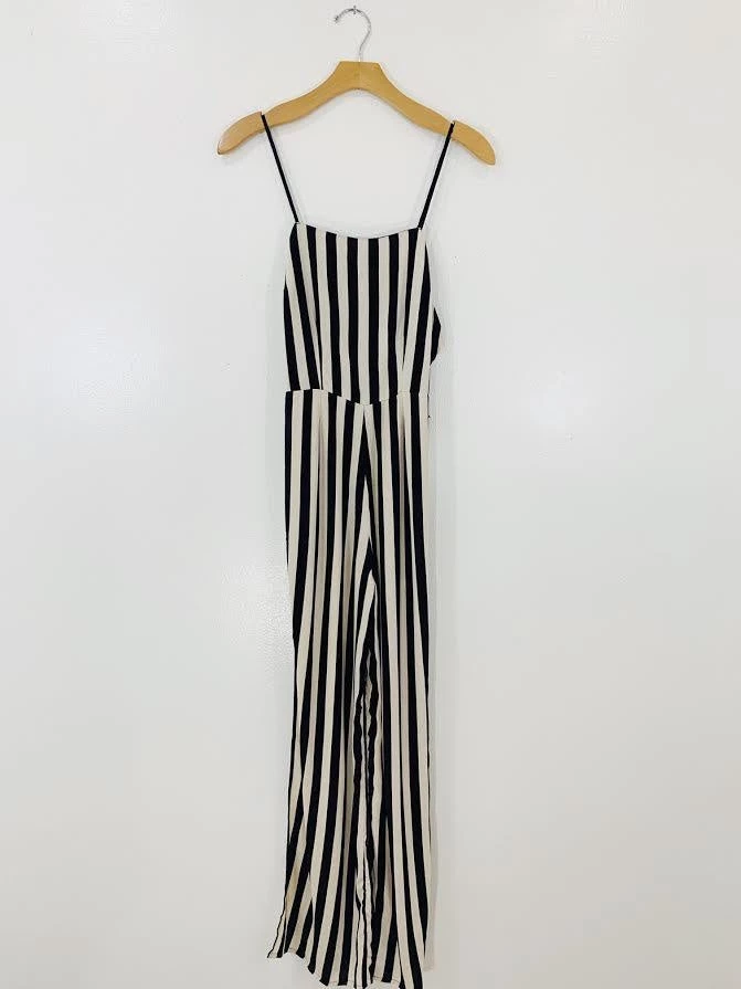 The Golden Hour Jumpsuit is a very flattering black and cream striped bell bottom sytle jumper, with adjustable staps and a low cut back.