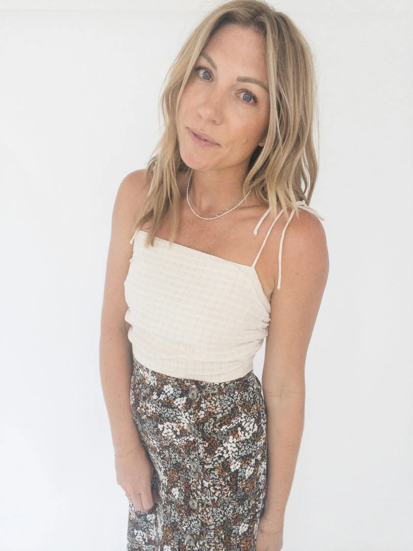 The Nuna Tank is a cropped woven cami in a pucker plaid. With adjustable spaghetti strap ties at the shoulders, a smocked back and ruching detail along the side seams she is easy to pair with jeans or a midi skirt. A great option for everyday wear.