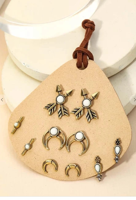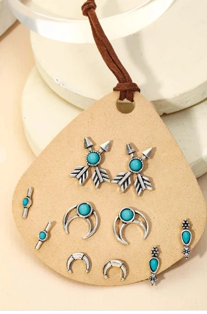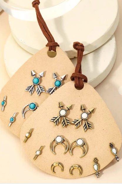 The Midnight Sun stud earring set comes in gold/white or silver/turquoise and is great for adding a western touch to your ears. They make a great gift or as a little treat to yourself.