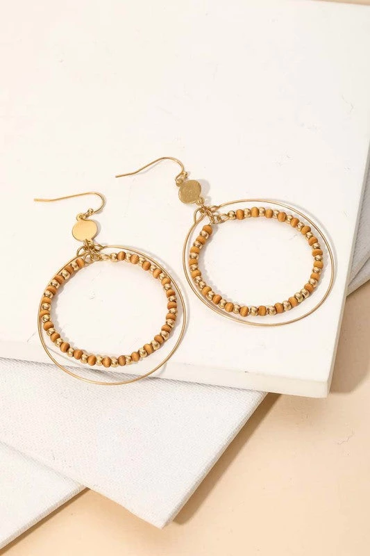 The Tiger’s Eye earring is a drop hoop circle earring in a pretty light brown and gold beaded design.