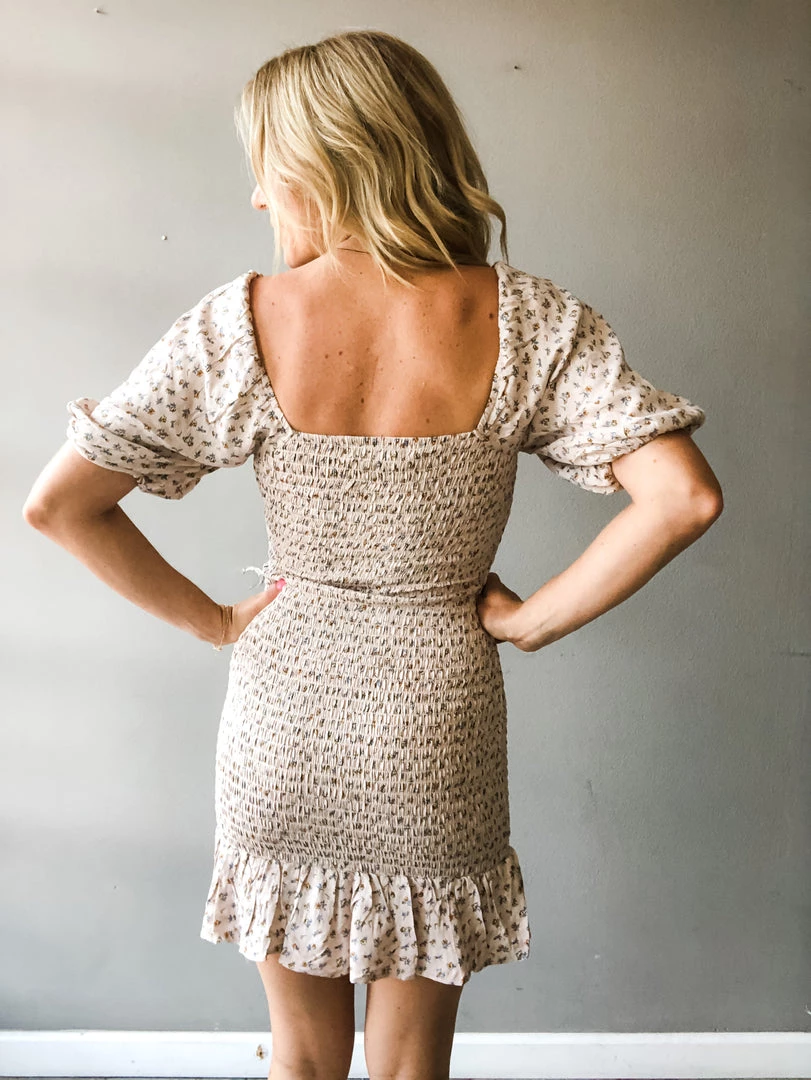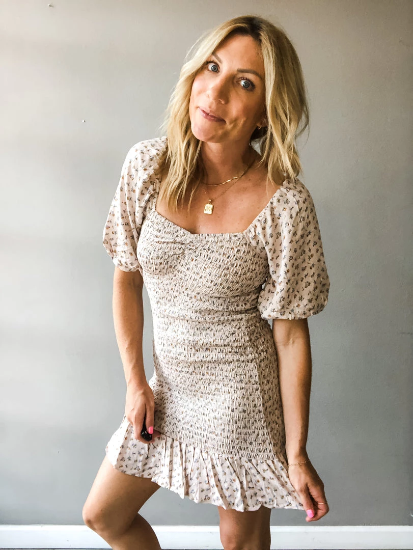 A smocked floral mini dress with ruffle hemline, puff sleeves and elastic arm band. A sweet, feminine dress that can be worn casual with sandals for brunch to dressed up with a heel for a wedding. A summer piece we are lusting over!