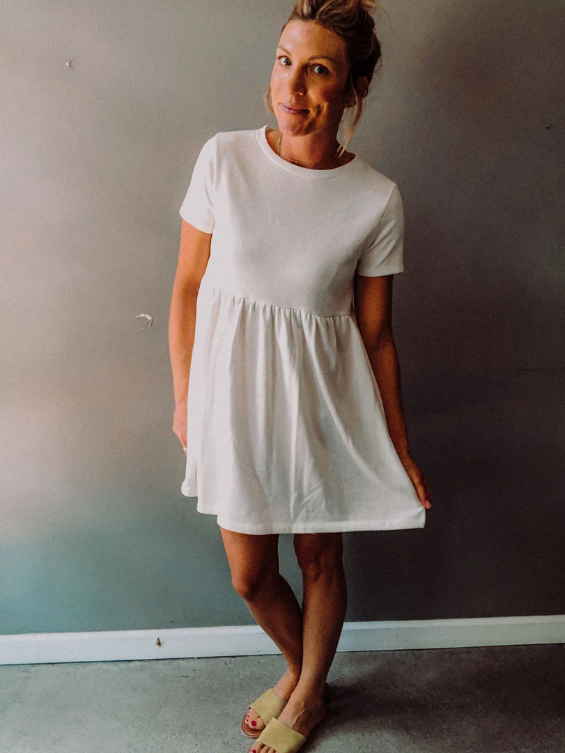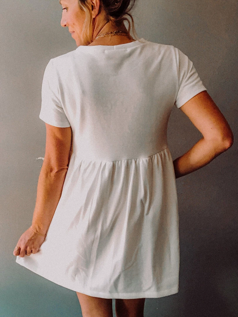 The perfect throw on and go summer dress. A white terry baby doll dress with crew neck and loose fitting skirt. Perfect over a swim suit for beach days or with sneakers for a casual look.