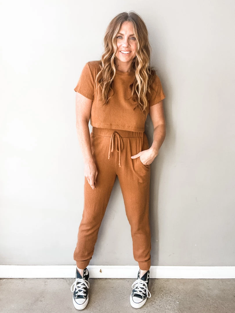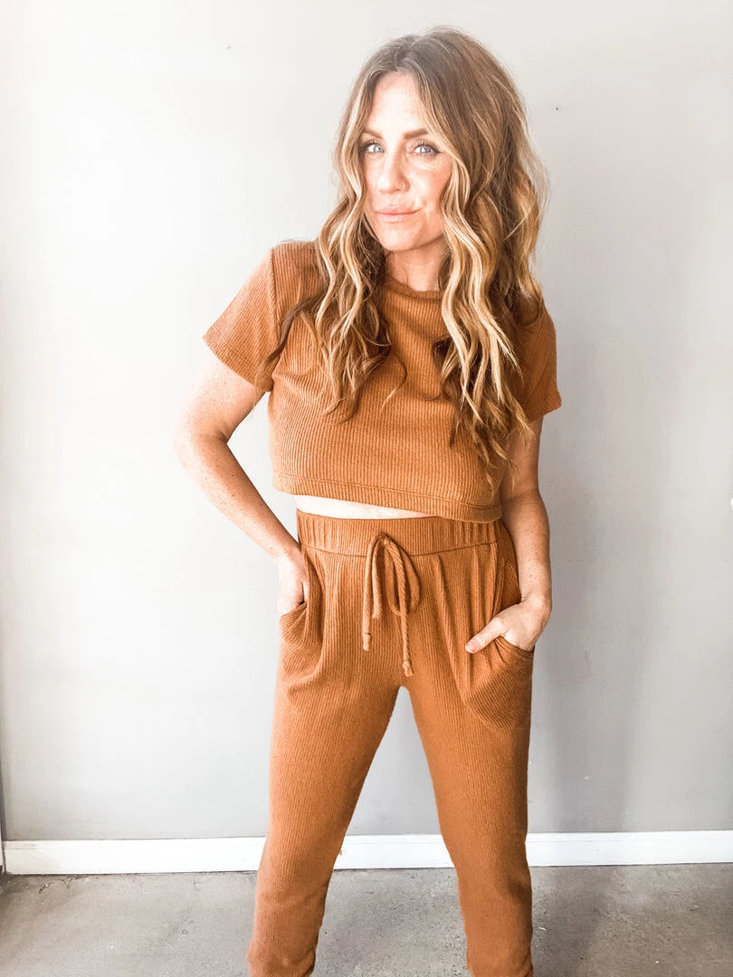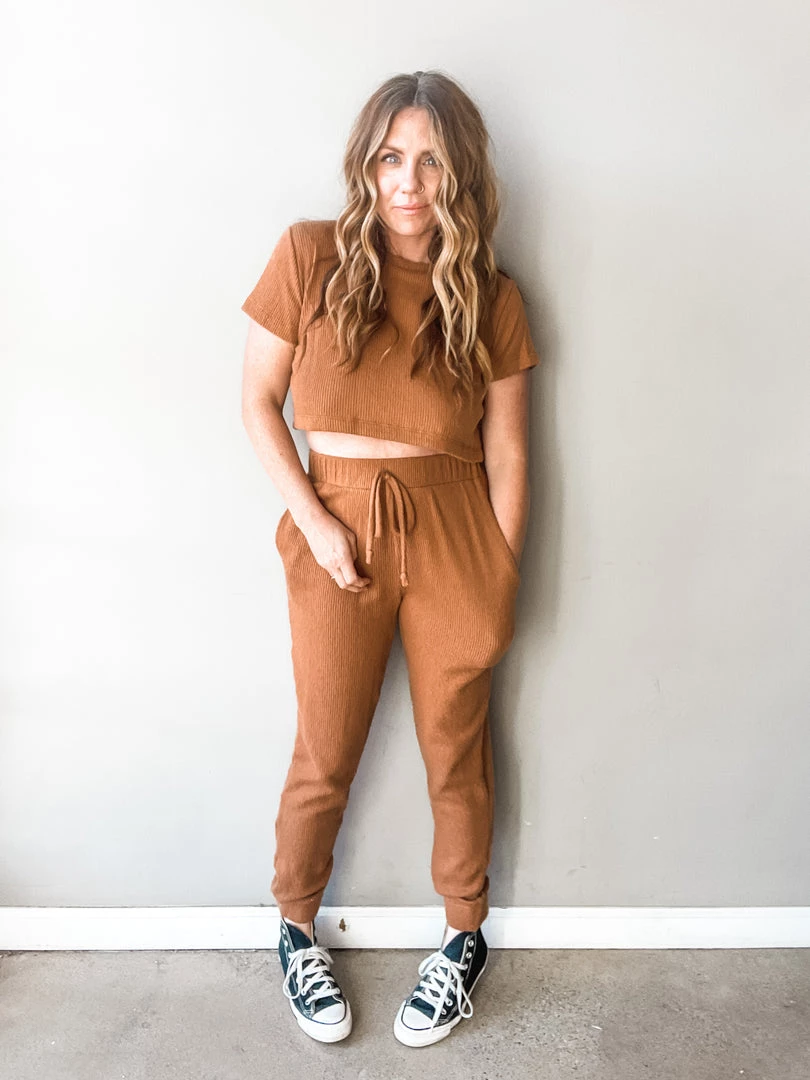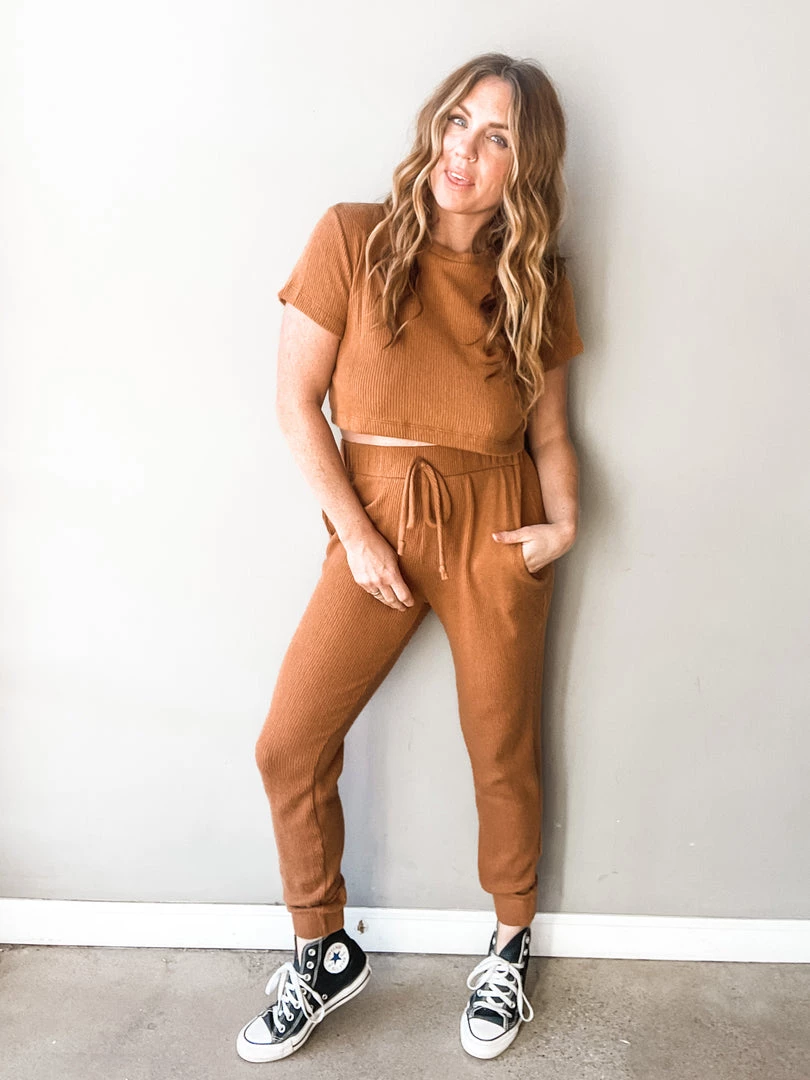 Guys. Run don’t walk to this little set. So dang cozy you will literally not want to take it off. The crop is an easy ribbed short sleeve. These chic cozy joggers have fun side pocekts, a tie front, high waist and jogger tapered leg. We love it as a set with the matching joggers!