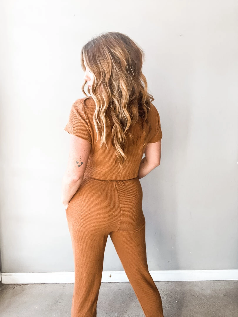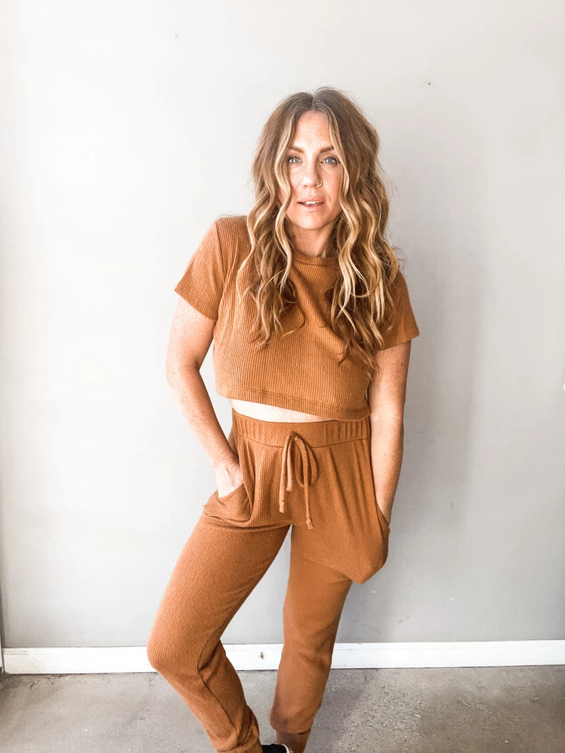 Guys. Run don’t walk to this little set. So dang cozy you will literally not want to take it off. These chic cozy joggers have fun side pocekts, a tie front, high waist and jogger tapered leg. We love it as a set with the matching crop!