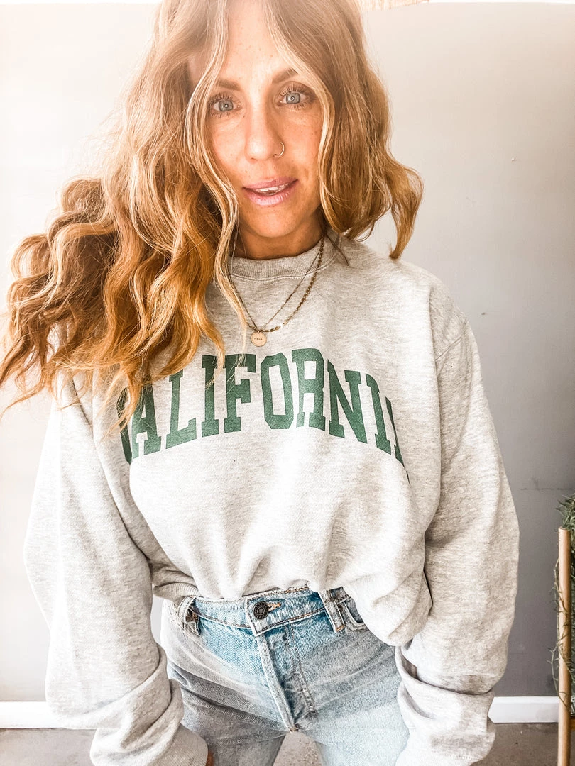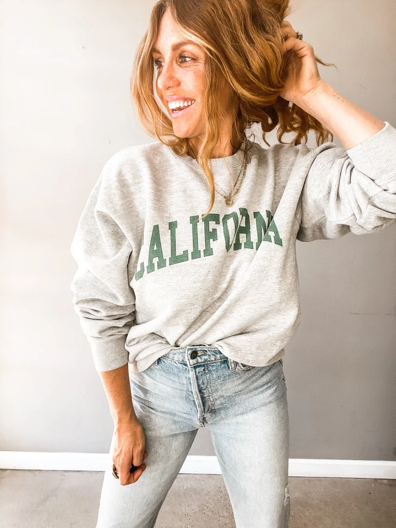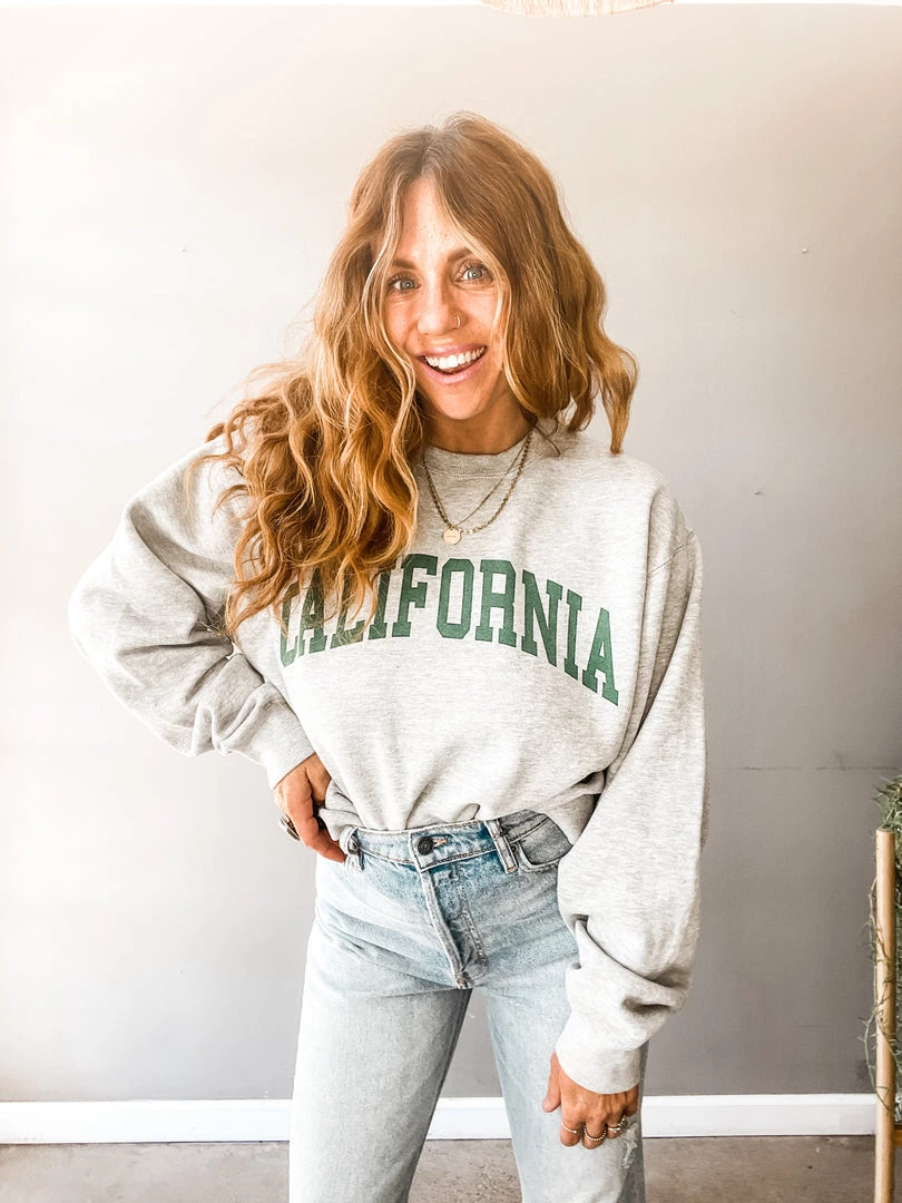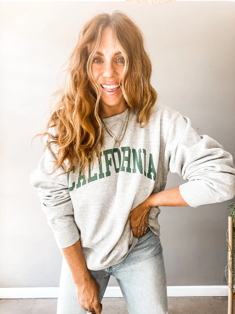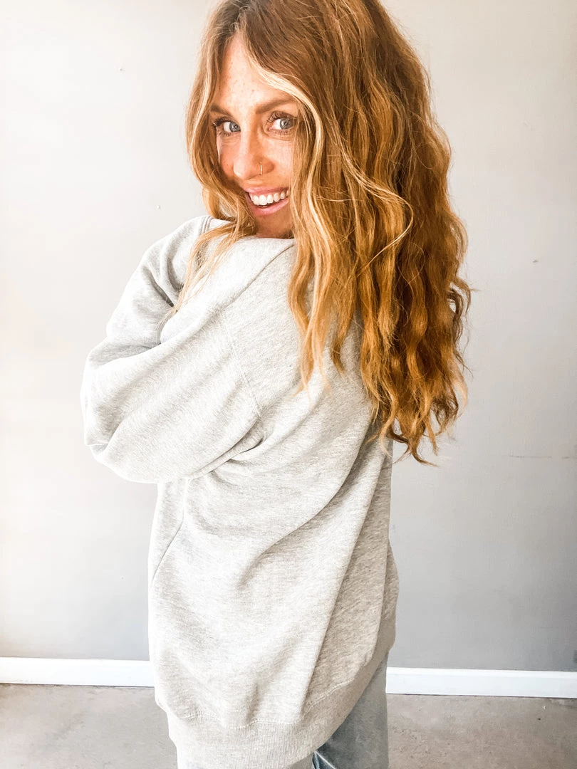 I was California when California wasn’t cool. Obsessed with this super yummy (so soft and cozy) oversized heather grey + green pullover. Pair it tucked in with your fav high rise denim or out and cozy with your leggings and workout wear! One size.