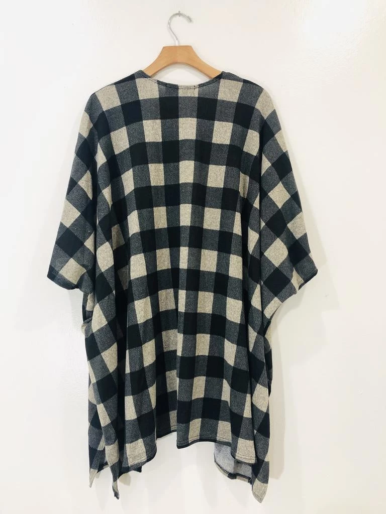 This checkered plaid cardigan is a kimono style cardi that we absolutely love for the holidays. So easy to toss on with your favorite basic tee, jeans and sneaks. Oh! Add the Paco Hat for good measure. This cardi is an open style oversized fit that can be sized down.