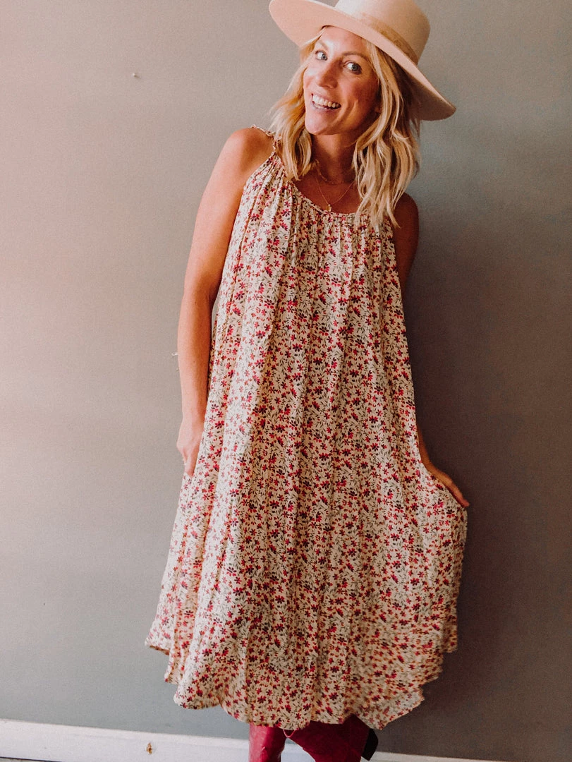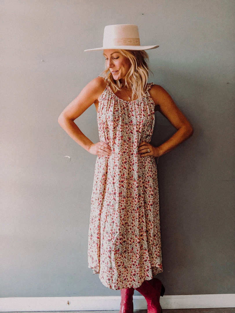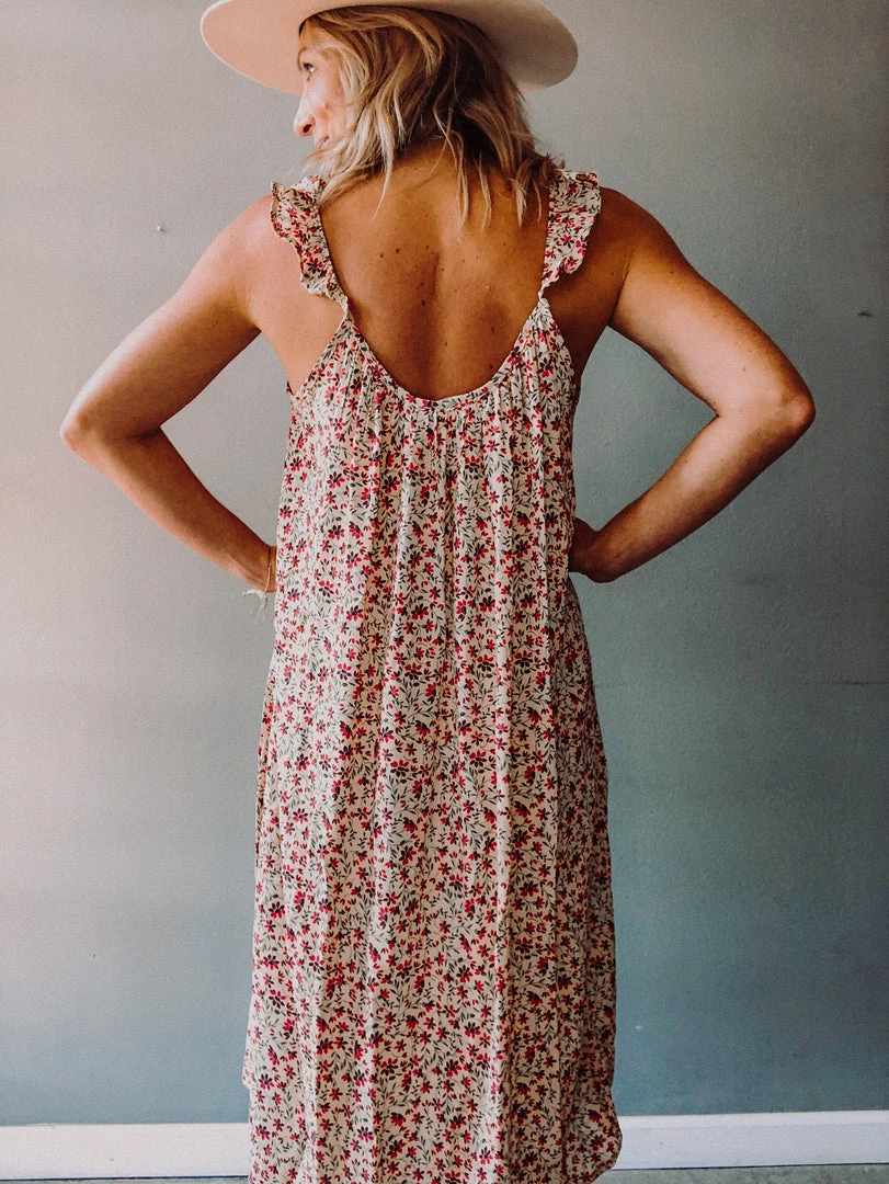 An all over floral, loose fitting midi dress with ruffle shoulder straps and scoop neck and back. Can be dressed up or down and paired with flats or boots like the Bambi from Matisse. We love a simple dress like this sweet number that can be an easy throw on or worn somewhere special.