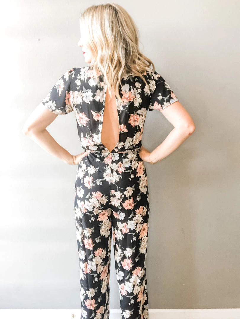 A floral pantsuit with crossover front and open back with button closure. This jumpsuit is so fun dressed up or worn casual with flats. Lightweight with an elastic waist and loose, cropped legs that hit at the ankle.