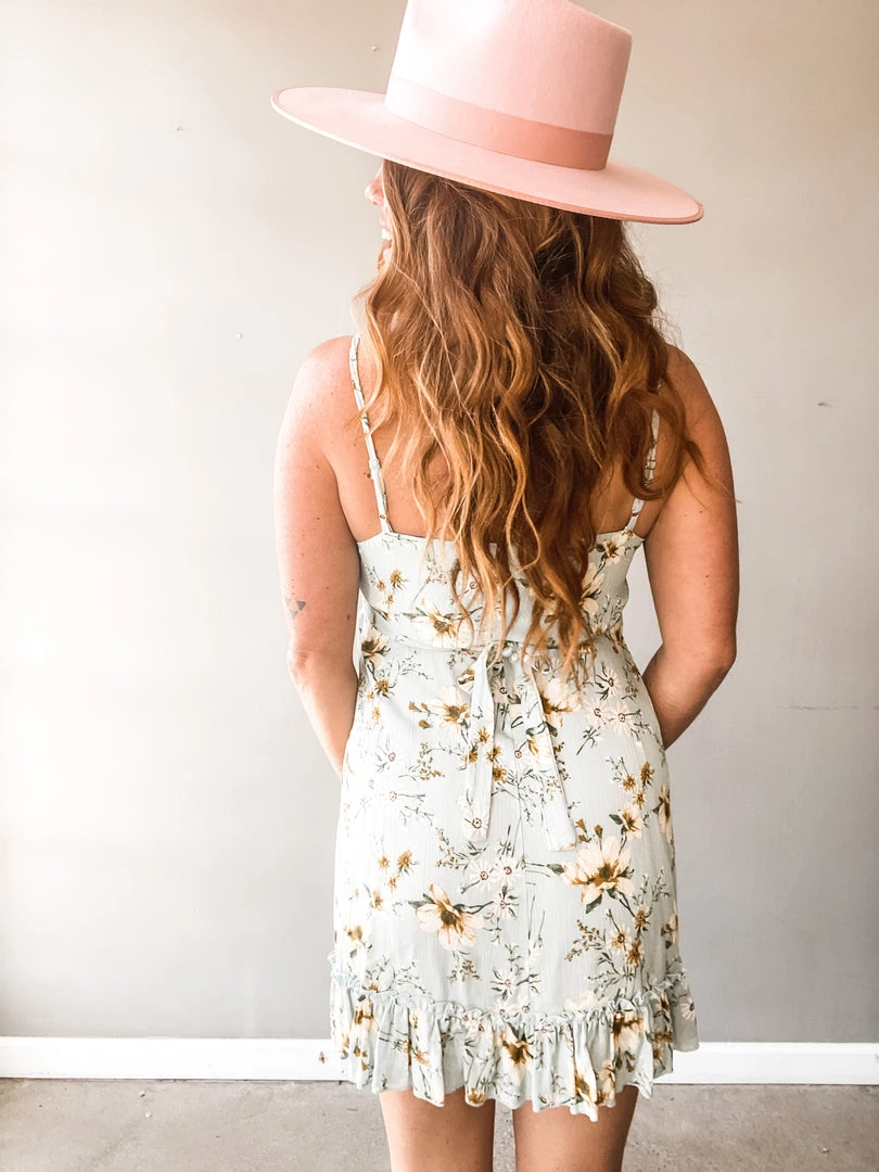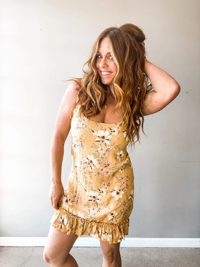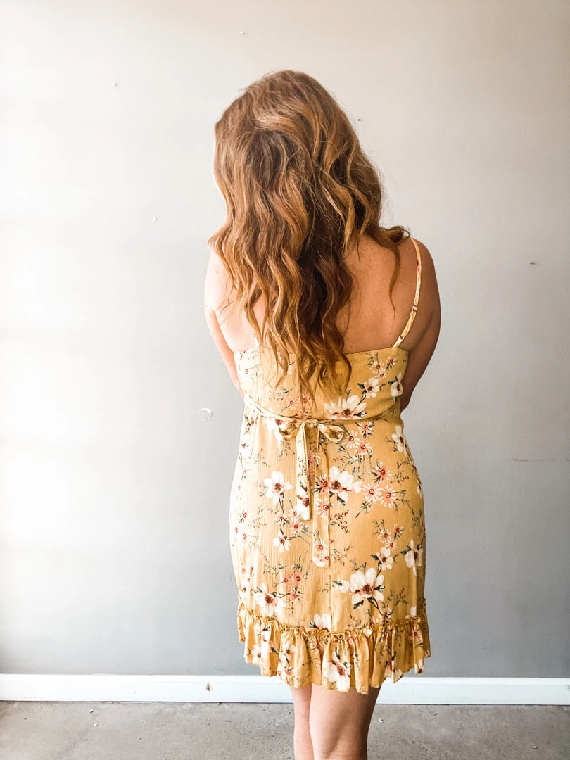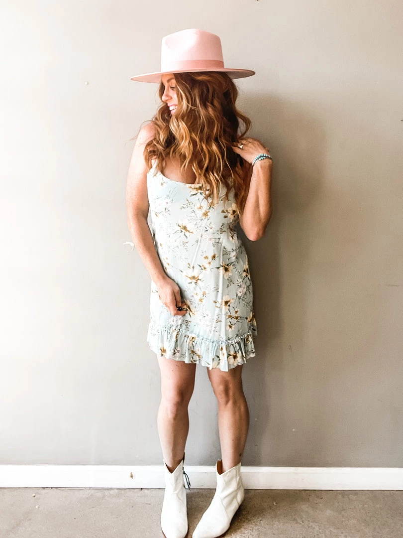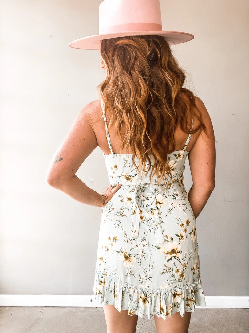Say hello to spring in the Botanical Gardens Dress. A pull on adjustable spaghetti strap mini dress with ruffle hemline and back tie. Pair with the Bambi Boots for a look we can not resist. Available in two colorways.