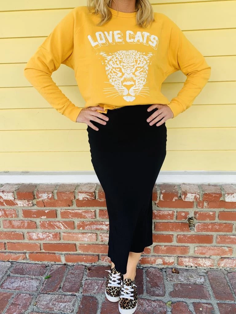 Our Fall in Love Middy Skirt is a lightweight, mid length, high rise skirt with a fitted top section and flowier fit at the bottom hem. So perfect for all your tuckeck in graphic tees and sneakers.