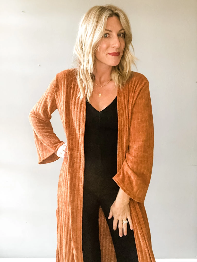 The perfect kimono with a retro vibe to layer over just about anything this fall. Featuring a long silhouette with side slits and bell sleeves this rust color kimono is the perfect addition over jeans and a graphic tee or your go to mini dress and some booties. She is chic and fun and a great add to any wardrobe.