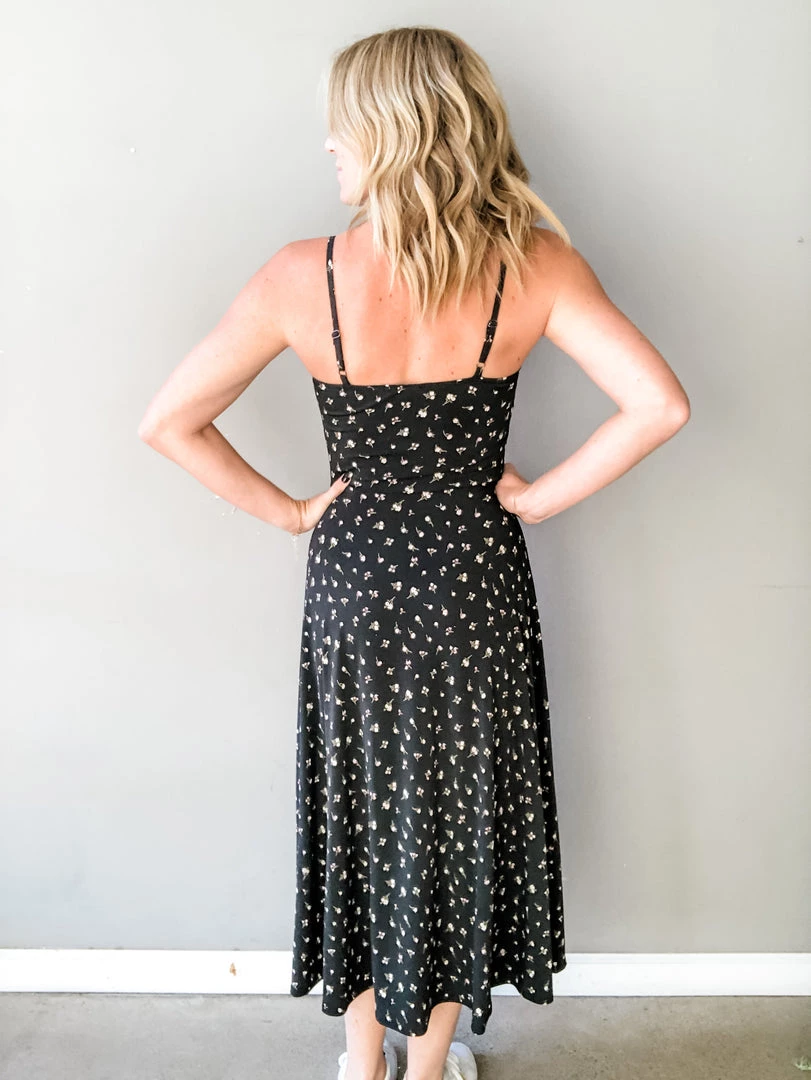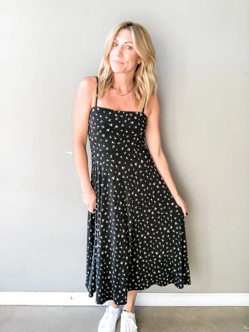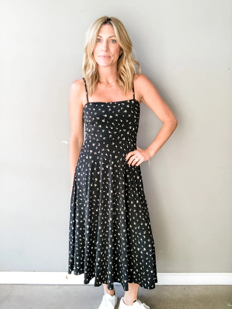 Keep it going in this flirty and floral midi dress!! A flattering fit with its aline silhouette and slight flare in the hem. With adjustable straps and minimal floral pattern throughout. A square neckline and cool jersey feel make this little number so comfy on and so easy to wear!! We love it with barefeet in wide open living rooms or paired with our Caty Boot and Billie Fedora.