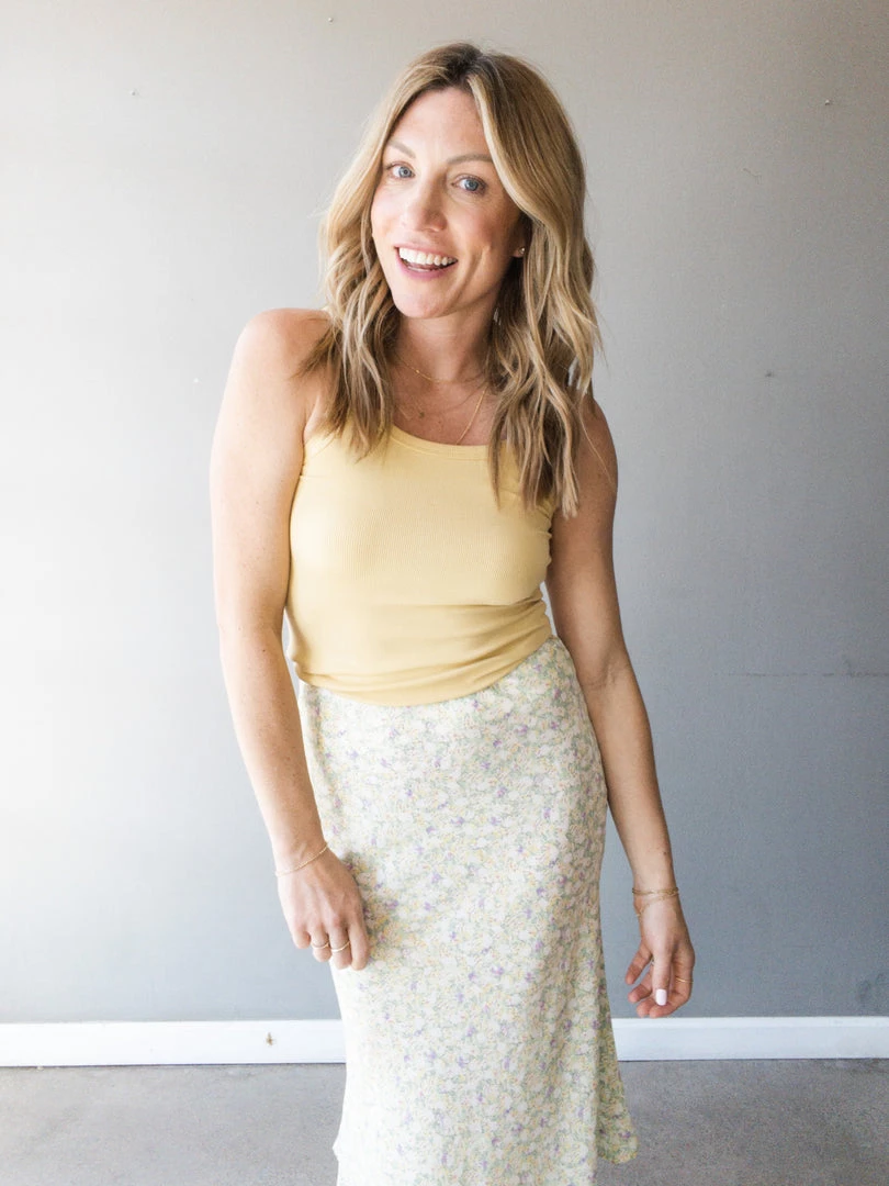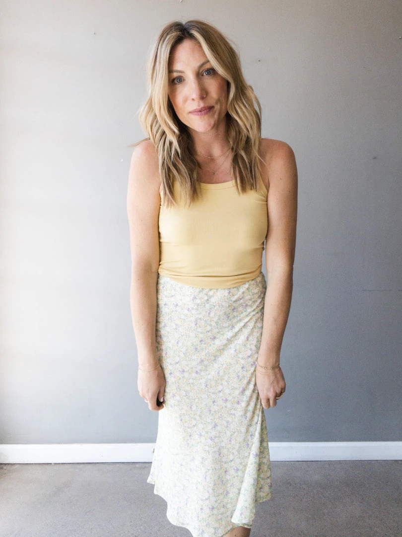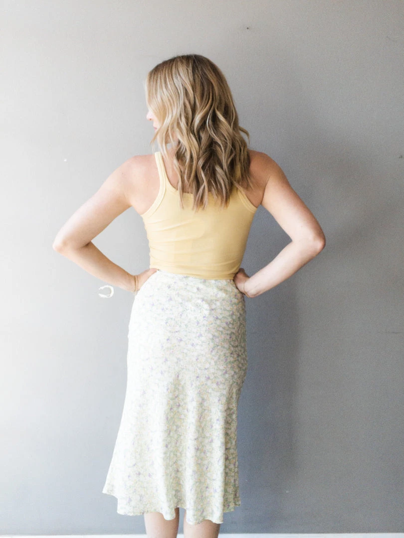 A pull on silky, slip midi skirt with an elastic waist and sage floral print. A closet staple due to its versatility. Pair with sneakers and a tee or a tank and booties. An all around favorite silhouette we love to play with.