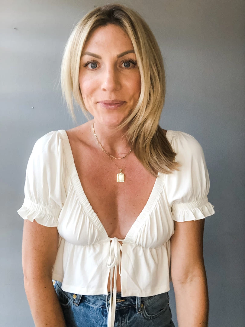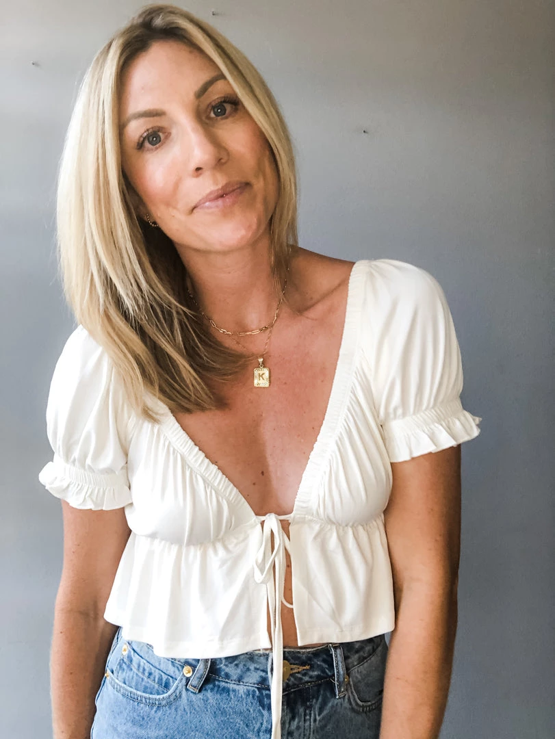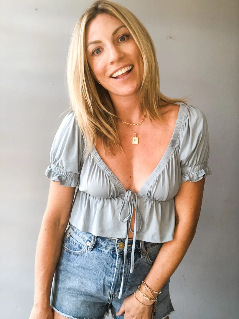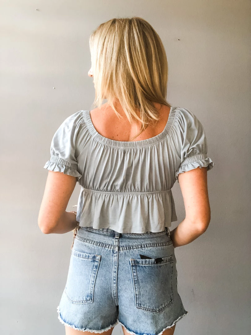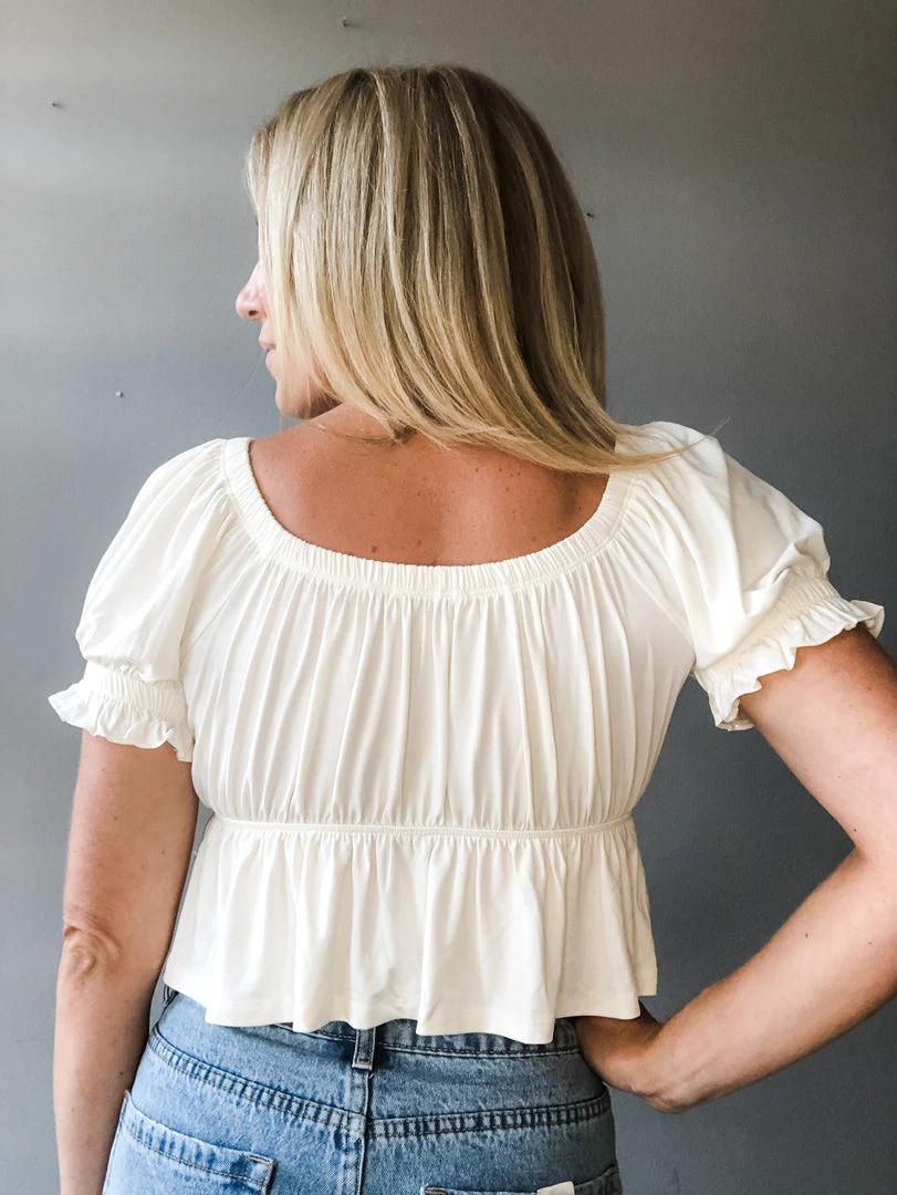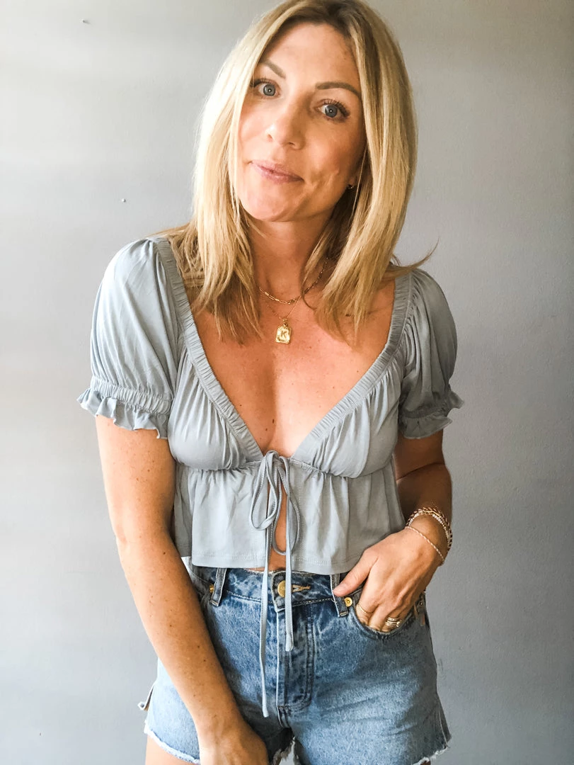 A solid baby doll crop with center front tie, short sleeves with elastic hemline and ruffle detail. Pair with your fav high waisted denim and beat the summer heat. Cute for a casual day out or dressed up for a night on the town. Available in two color ways.