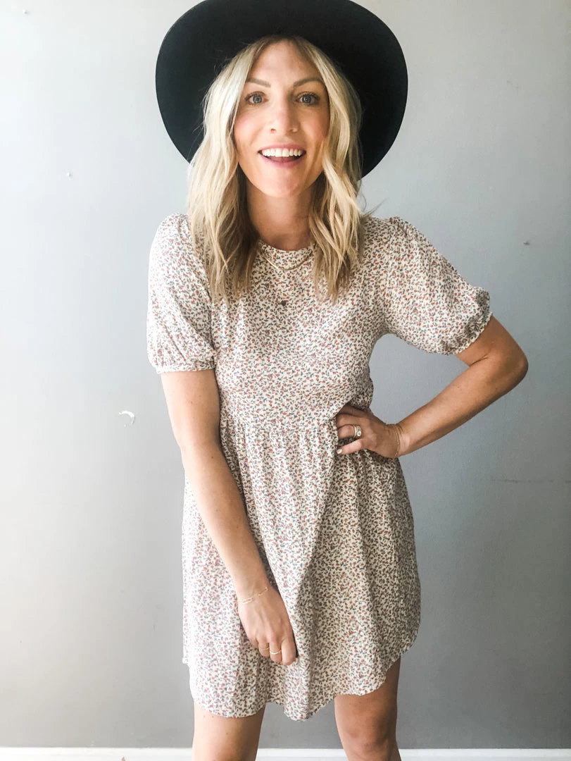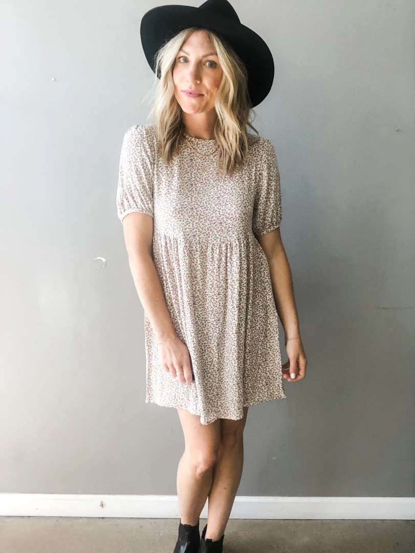 A tulip print babydoll dress that is perfect dressed up for the weekend with a sweet sandal and denim jacket or worn casually with slides while running errands. We love the easy silhouette of this gauxy dress that features the flirtiest little praire sleeves.