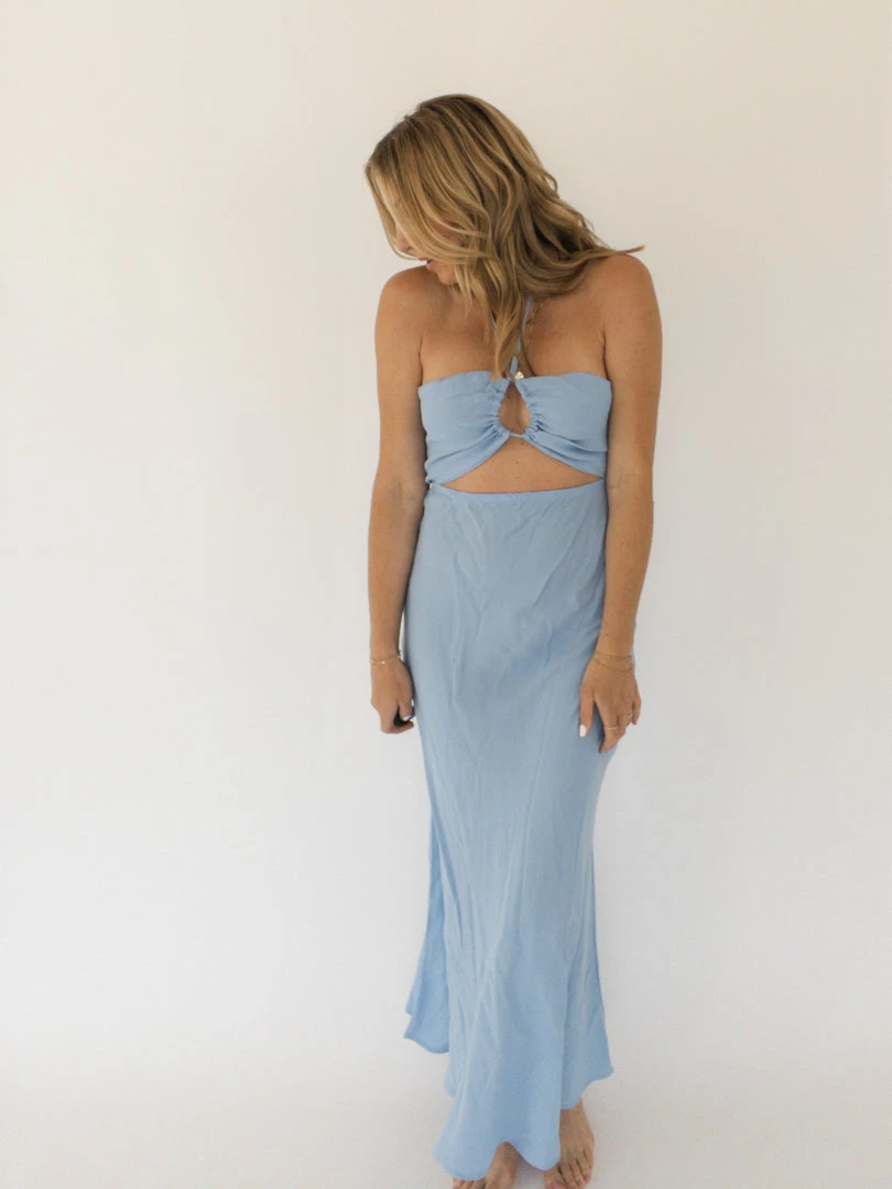 It’s now or never ladies and this baby blue midi dress is calling your name! With a center front cutout, bandeau style top, adjustable halter tie at the neck and at the back, this flirty little midi is perfect for a summer vacation or night out. Hits just above the ankle and can be paired with a strappy sandal or heel.