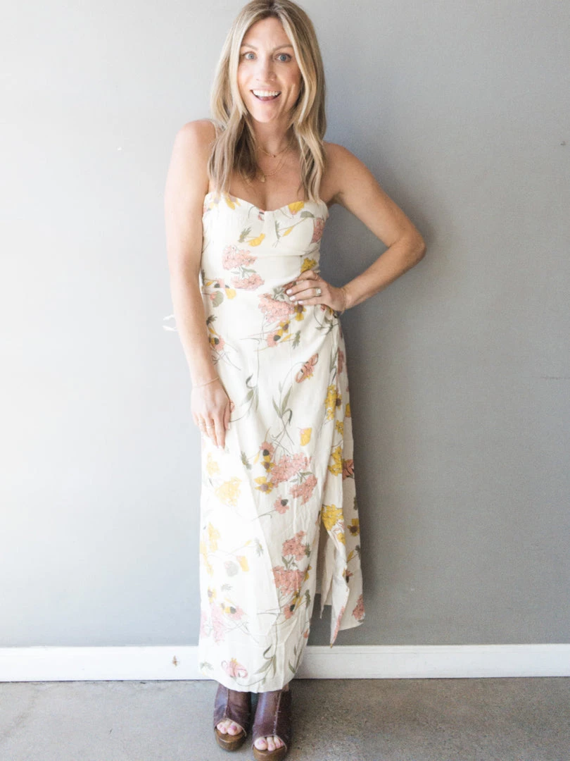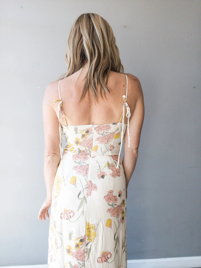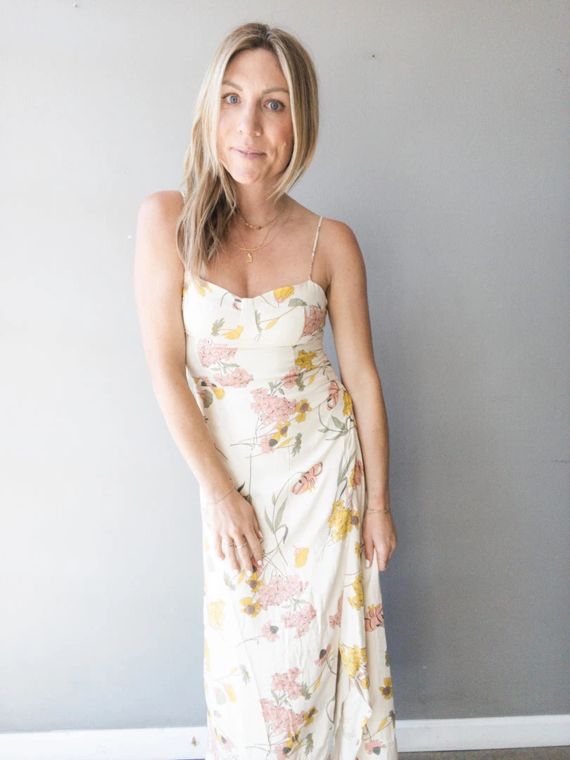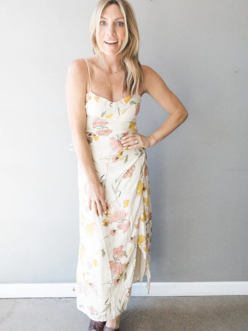 The Poppy & Sunshine Midi Dress is a floral lover’s dream. Equal parts feminine and flattering, this tie strap dress is a perfect Spring piece. An accentuated bustier style top with wrap dress style hem. With it’s drapey hem, comfy smocked back and high waist fit this sweet and sunshiny dress will gets lots of wear and twice as many compliments. Double lined with hidden zipper at center back.