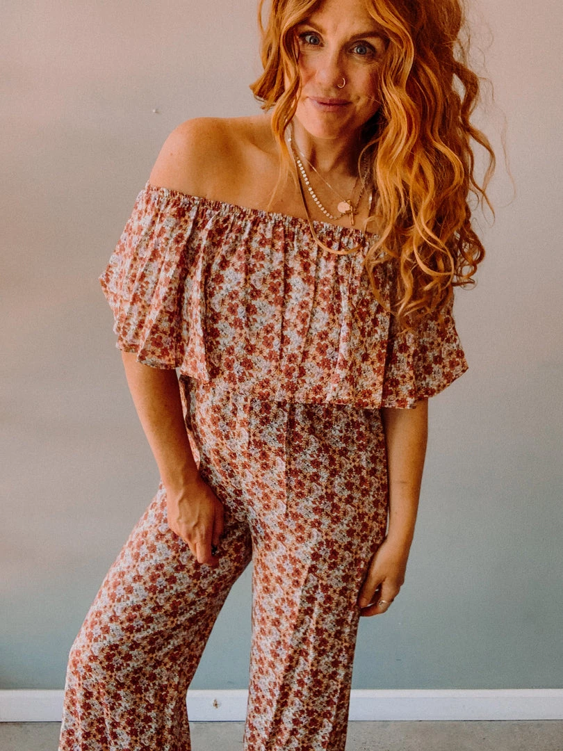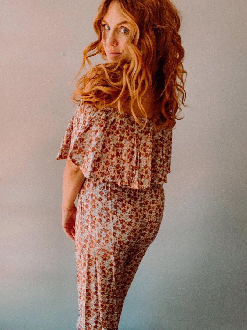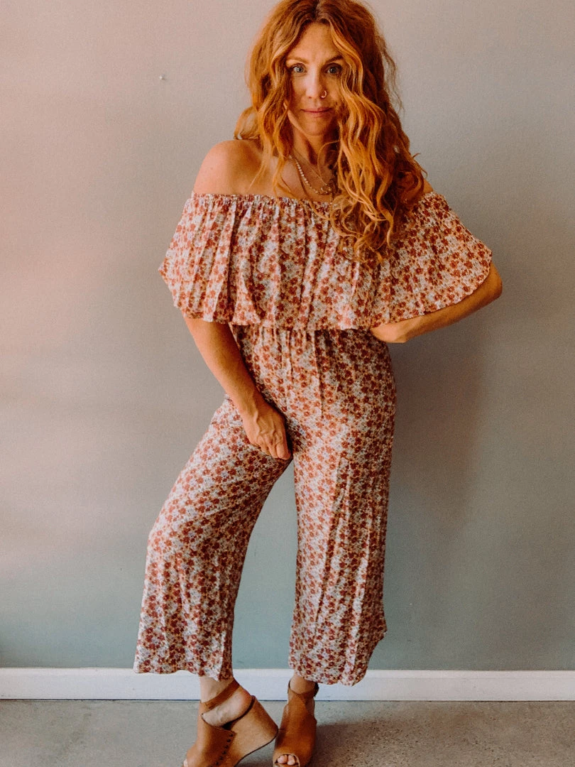 The Crimson Jumpsuit is an easy, super flattering piece with a fun ruffle off the shoulder top (completely elastic for comfort and flexible sizing) and cropped flare leg. Love the fall inspired floral color palette that makes this the ultimate transition piece!