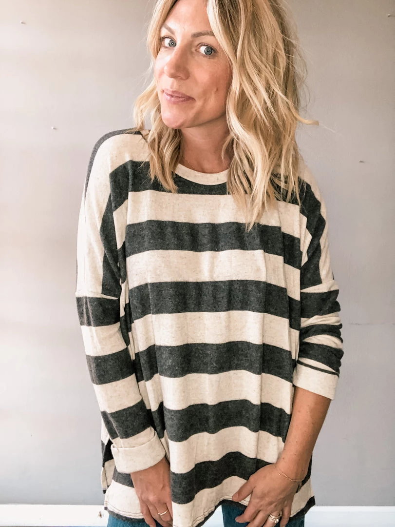 An oversized striped long sleeve dolman that is cozy and loose, perfect for lounging or paired with denim and booties. An all around favorite silhouette each fall. Snag yours and we promise you will live in it as the cool weather approaches.