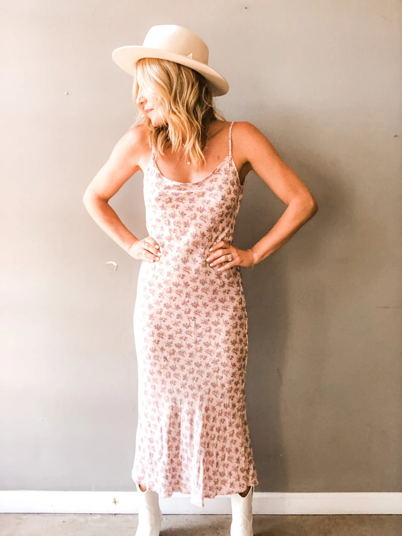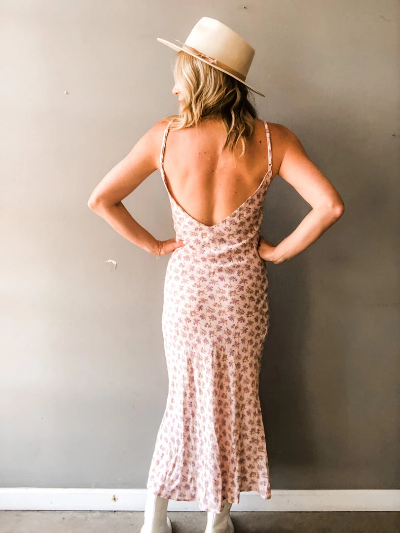 An all over floral slip stlye midi dress with thin adjustable spaghetti straps, a low v scoop back in a light weight fabric. A pretty little number that can be dressed up for any special occasion or paired with sandals and a denim jacket for a more casual look. A feminine piece we love!