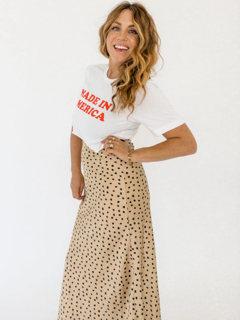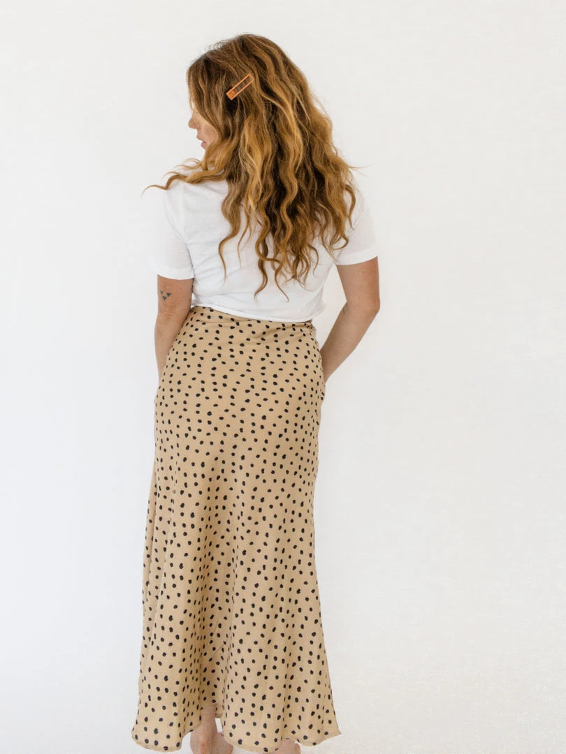 The Dottie Maxi Skirt is our go to piece all year long!! This gold spotted satin slip skirt has an elastic waist, straight fit and maxi length. This high waisted skirt is a timeless closet staple you’ll wear again and again.