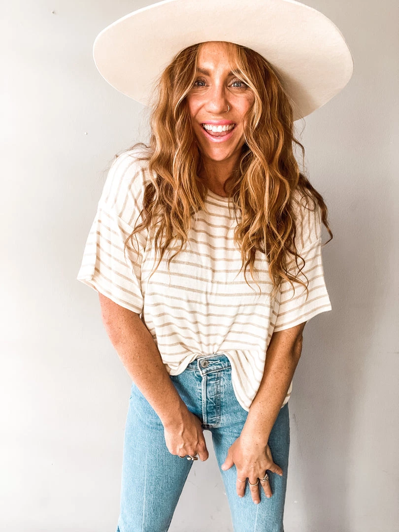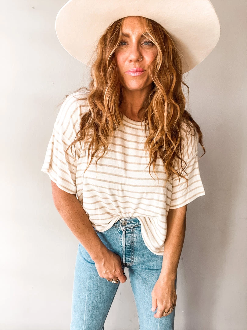 A slightly oversized tee with loose short sleeve and crew neckline. An easy basic that can be worn so many ways!! Wear it loose and free or tucked in at the front. We love it for those off duty days or dressed up for those endless zoom meetings.