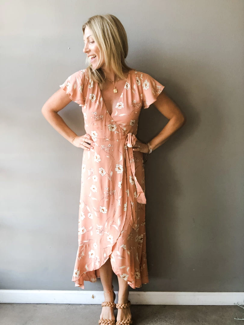 An all over floral wrap style maxi dress with ruffle hemlines. So pretty and feminine. Can be worn so many ways…dressed up with a heel, with your go to bootie or a sandal. Love the versatility of this dress coupled with the sweet, girly details. A win for any occasion.