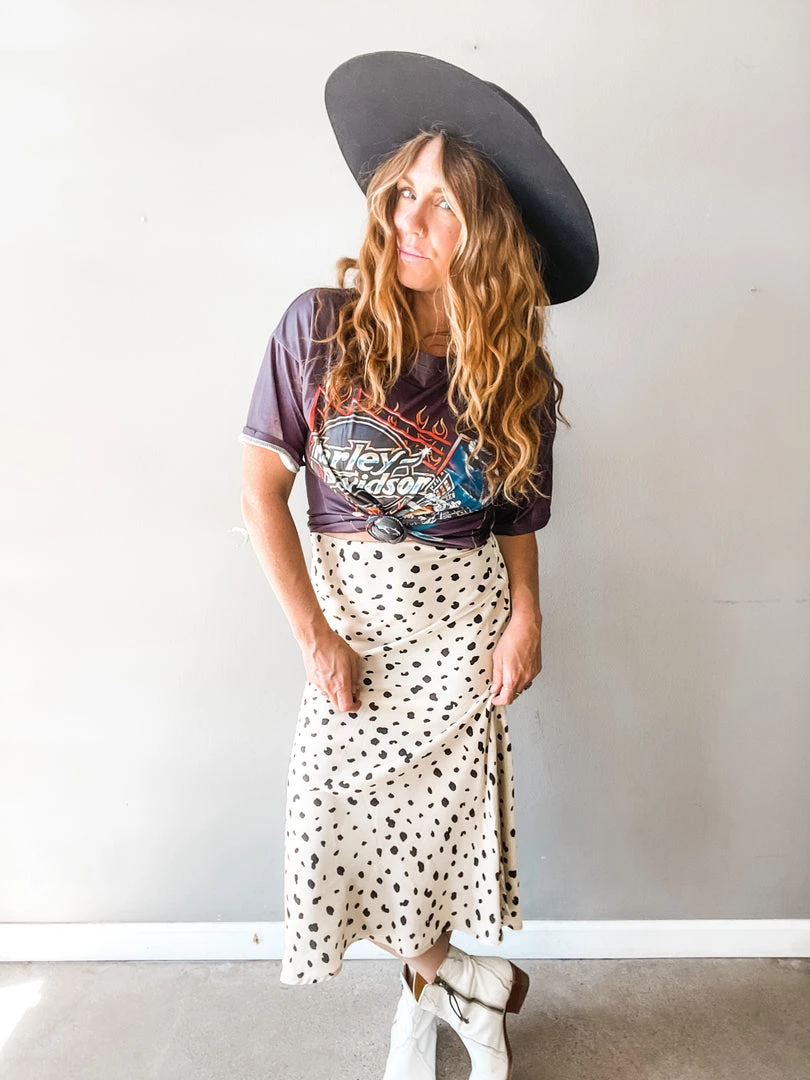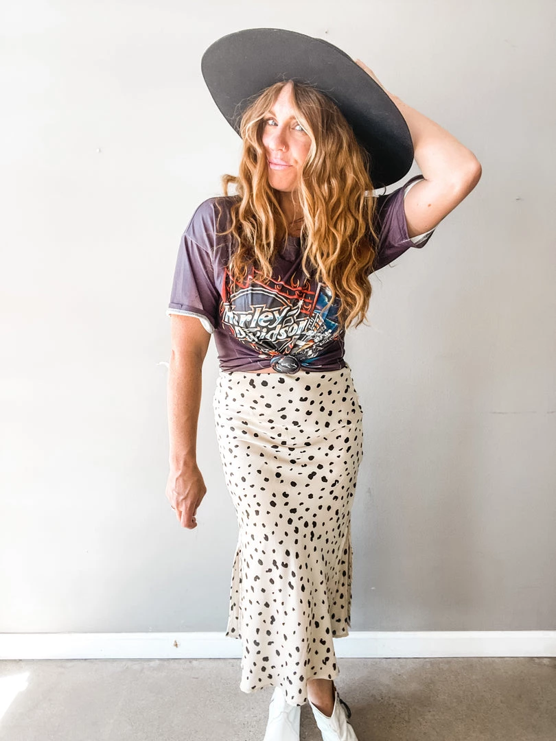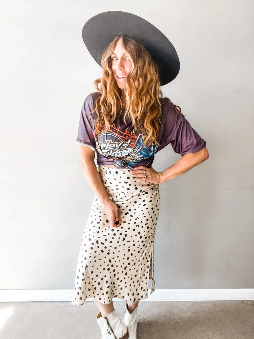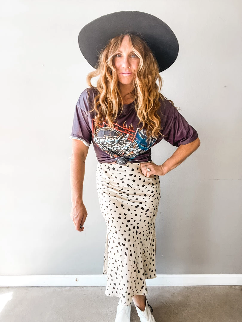 And just like that, the perfect midi arrived!!! This high wasited, hourglass silhouette fits like a dream (although runs small, so size up)! We love the easy nature of this great neutral with 2 side slits. Pair it with a graphic tee, bodysuit, or a crop!!!