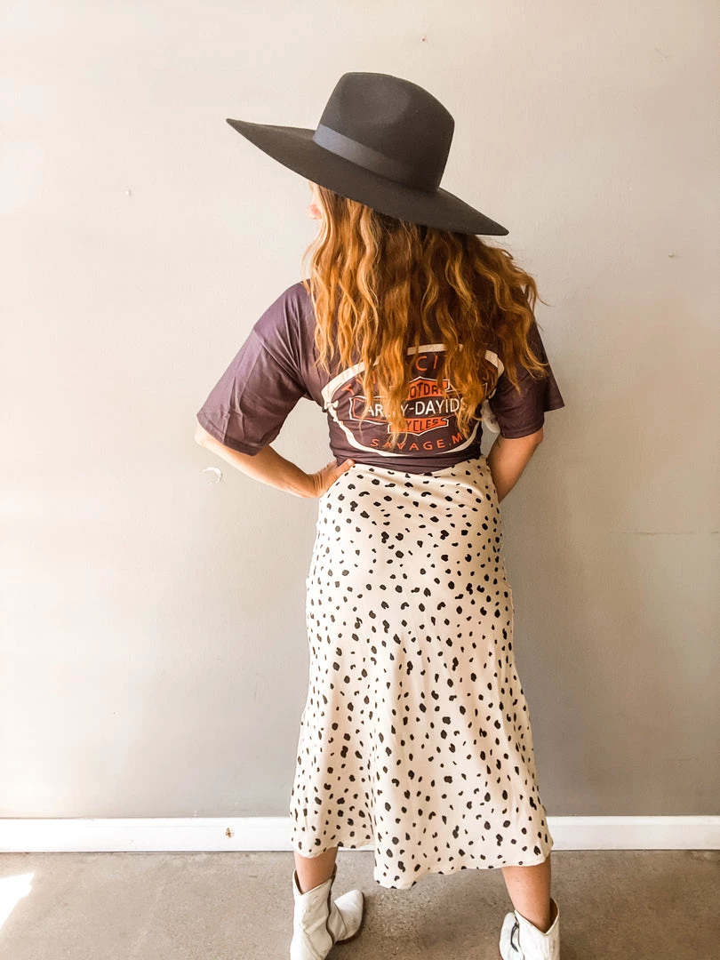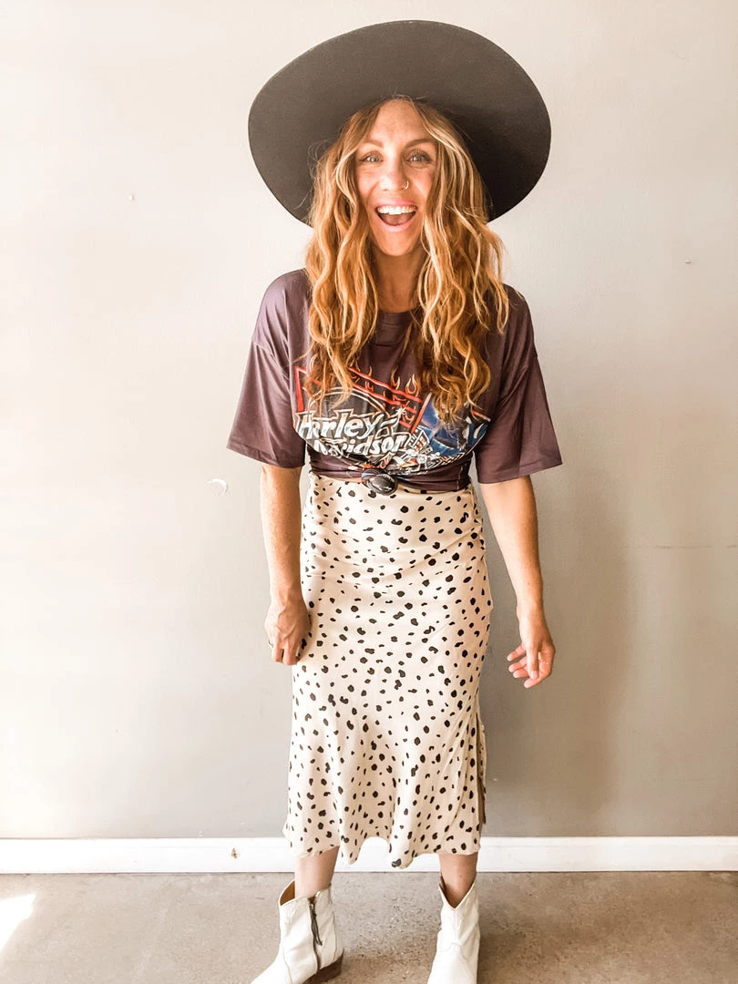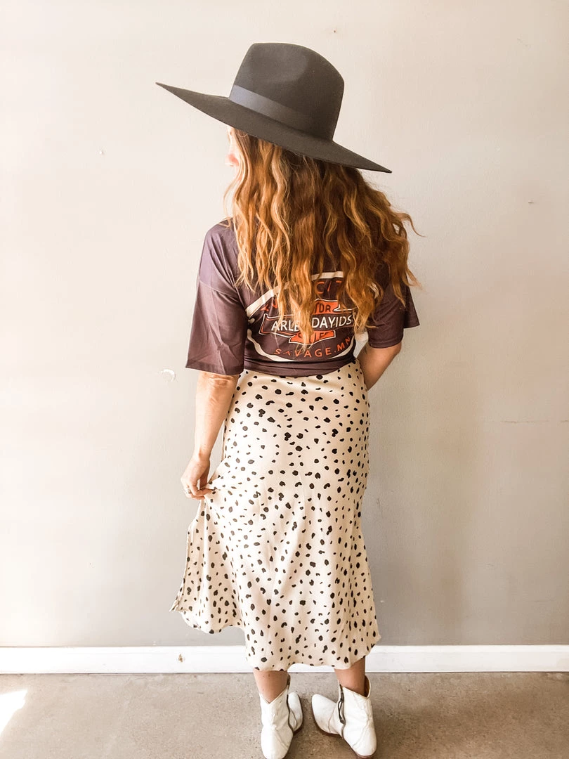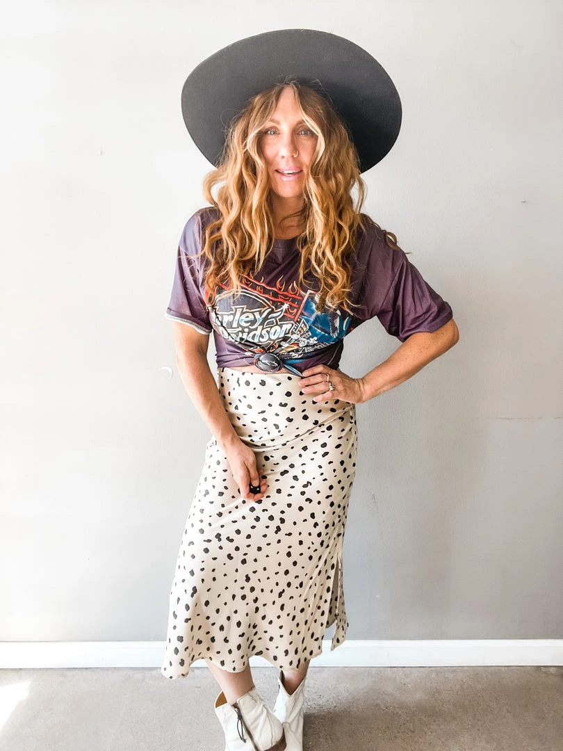 And just like that, the perfect midi arrived!!! This high wasited, hourglass silhouette fits like a dream (although runs small, so size up)! We love the easy nature of this great neutral with 2 side slits. Pair it with a graphic tee, bodysuit, or a crop!!!