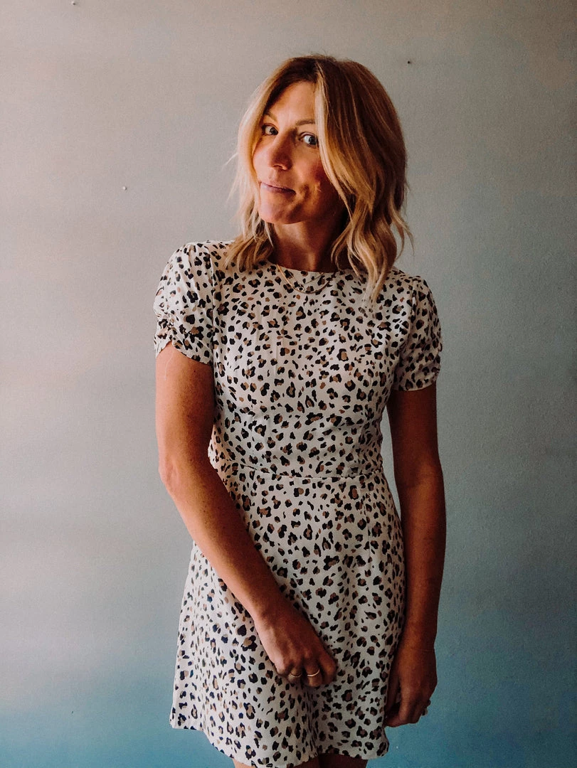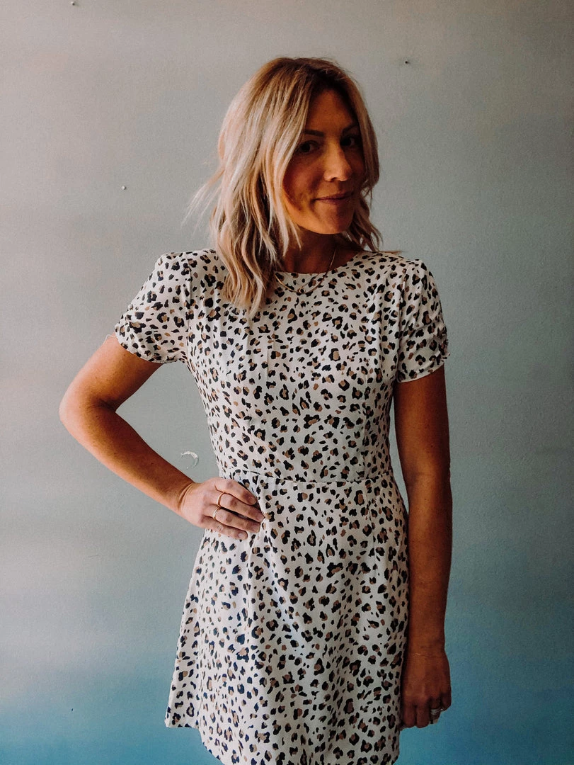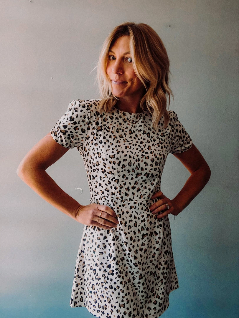 Fun leopard print skater dress with high neck and zipper in the back. Can be dressed up for a night on the town or worn casual with a pair of sneakers. Runs small.