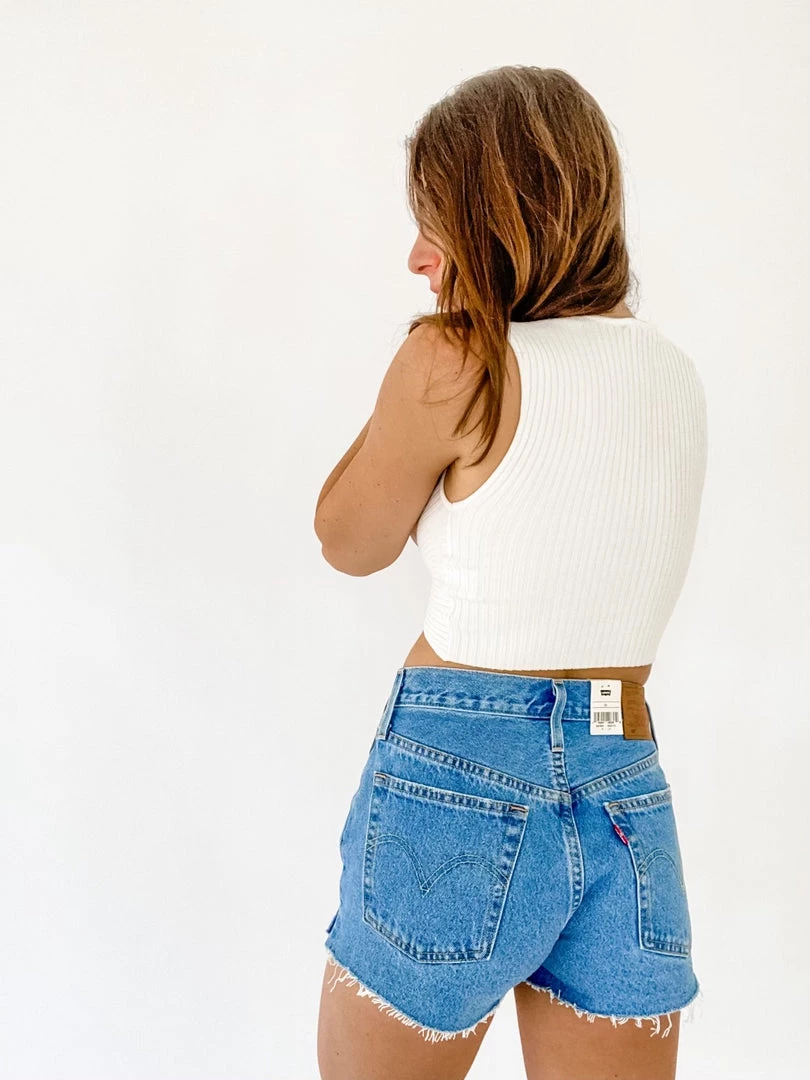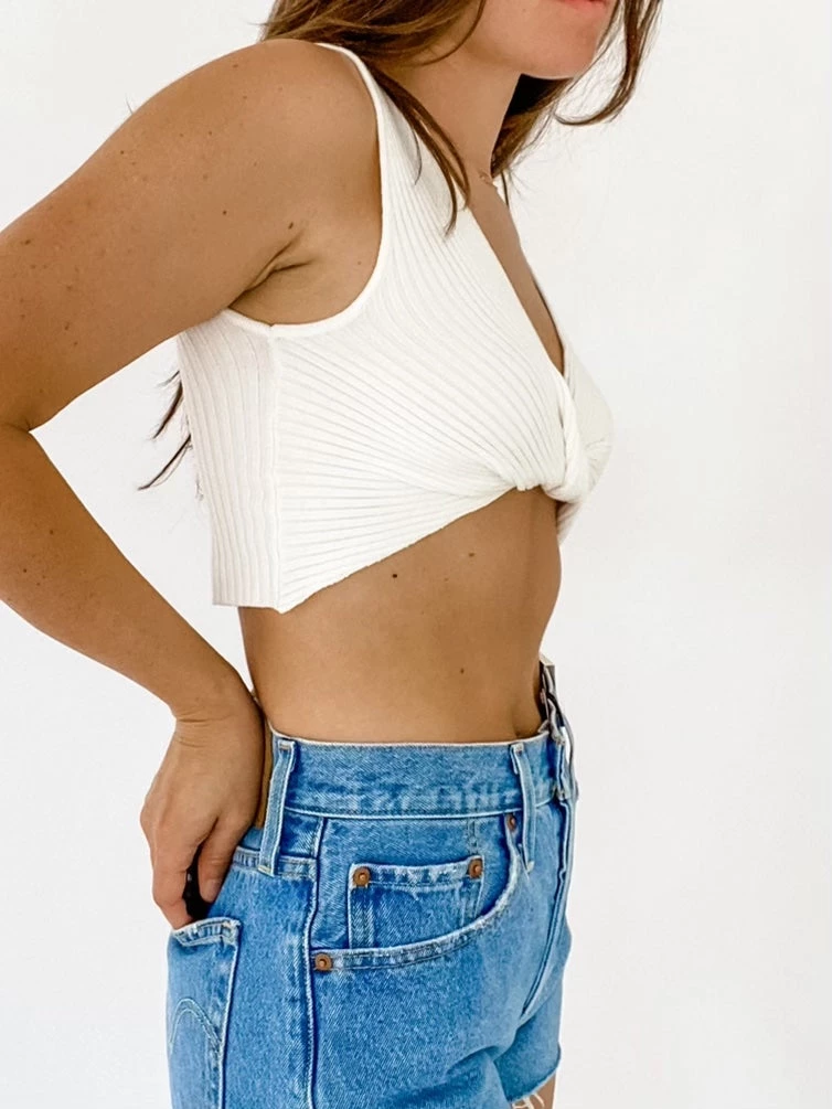 This ribbed knit twisted tank is a perfect way to jazz up your summer outfit. It’s got wide shoulder straps, a plunging neckline, and fits cropped. It is buttery soft and looks real good paired with denim or a skirt.