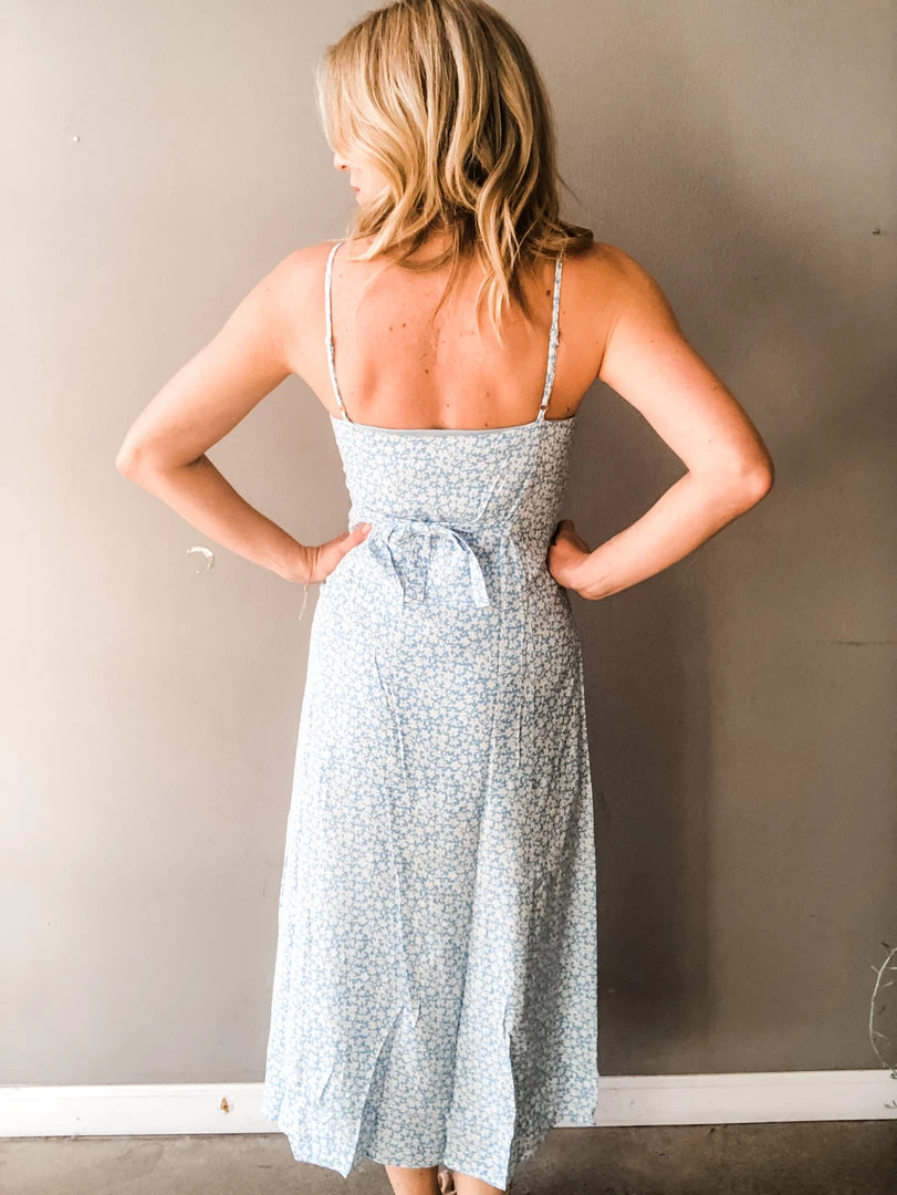 Spring is here and this slip dress has us ready! An ankle length pull on slip dress with adjustable shoulder spaghetti straps and back tie detail. Perfect with sneakers and layered with a jacket as we transition to warmer weather. We love the flowy sit of the skirt and the sweet feminine feel of this midi dress. Fit note: Chest was very snug on model. See measurements below. Double Lined.