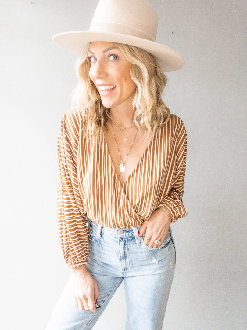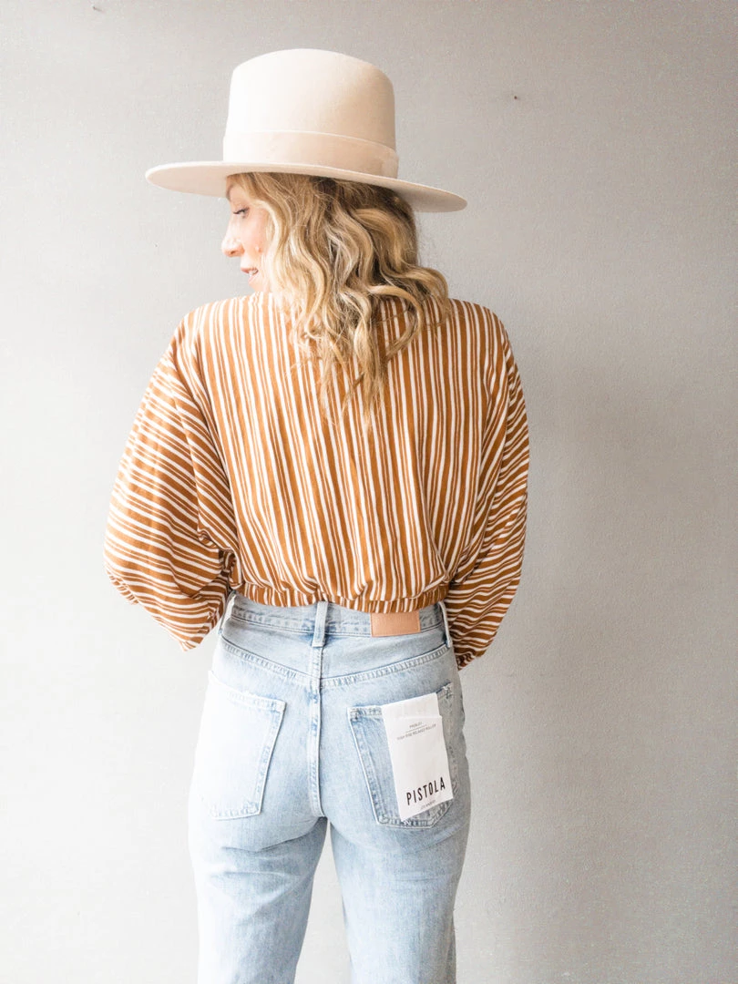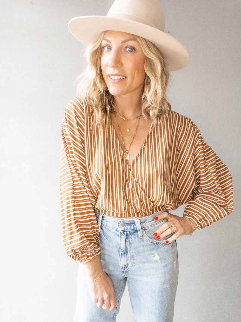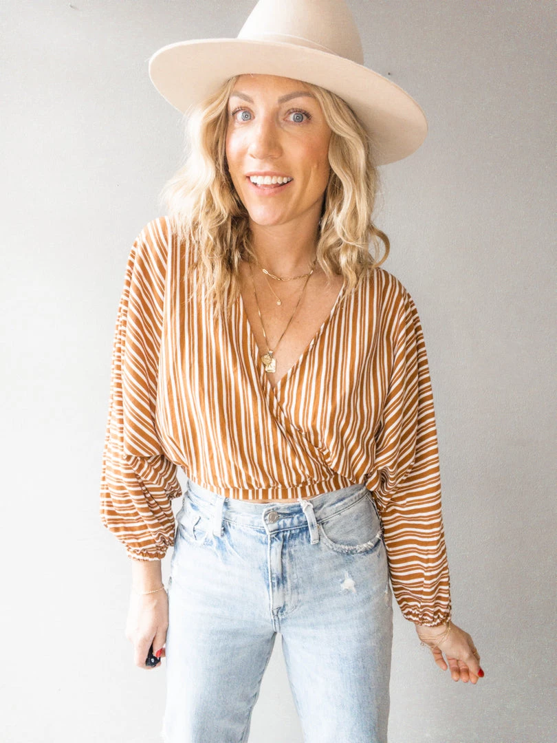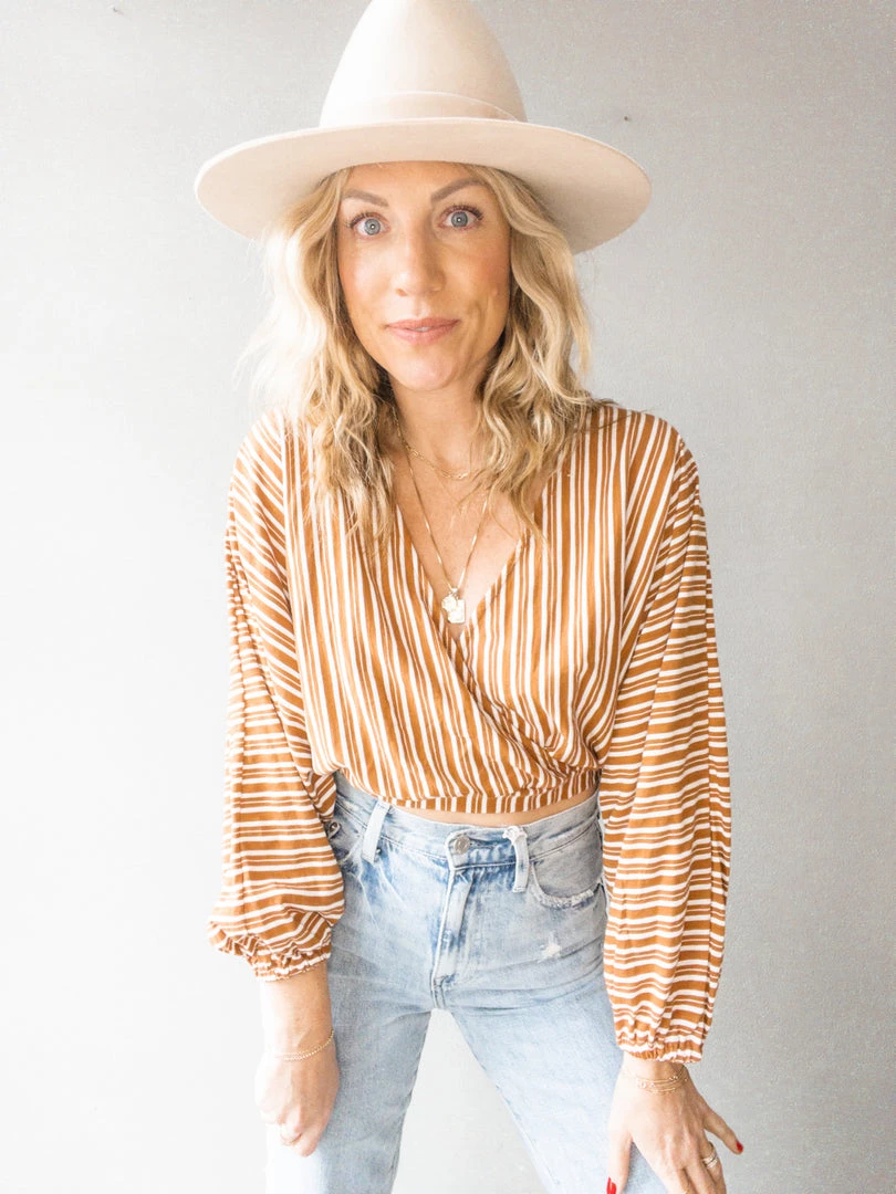 A cute little rust and ivory stripped crop we are loving. Features a dolman sleeve, cross over front and a cropped fit, this top is a great go to for a night out. Flirty and feminine, we know you will reach for this top time and time again.
