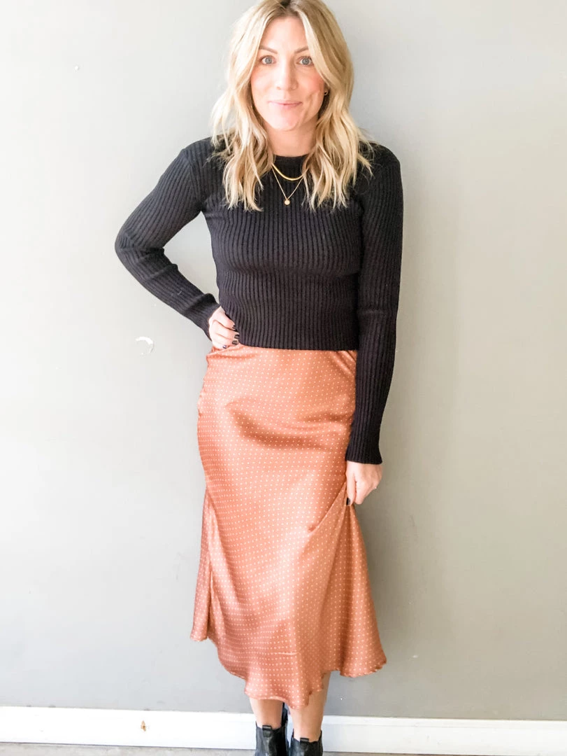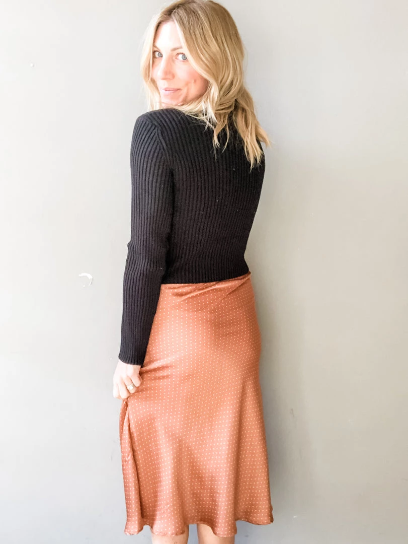 Dancing in the moonlight. You babes know how much we love a midi skirt! It lnever lets you down and this one amps up your closet and puts a fresh update on a tried and true style with it’s satin and silky texture!! A sweet fit with flowy hem that’s so easy to pair with any graphic tee or a comfy knit pullover.