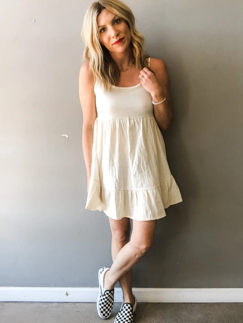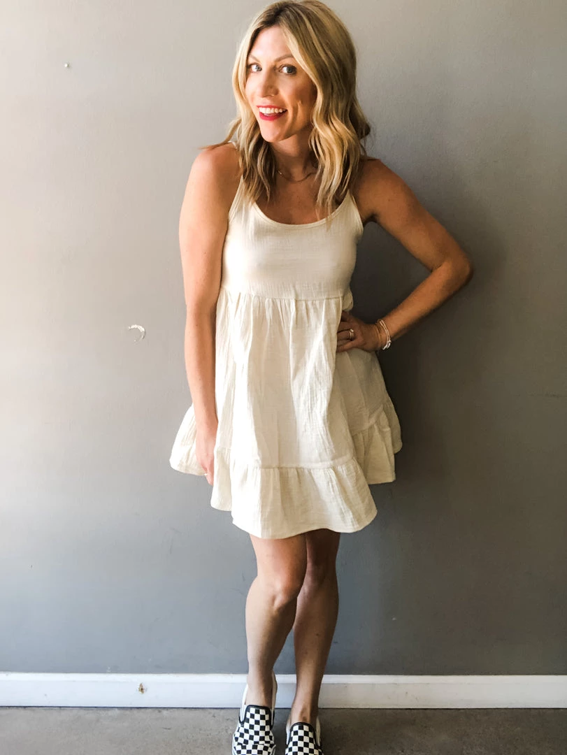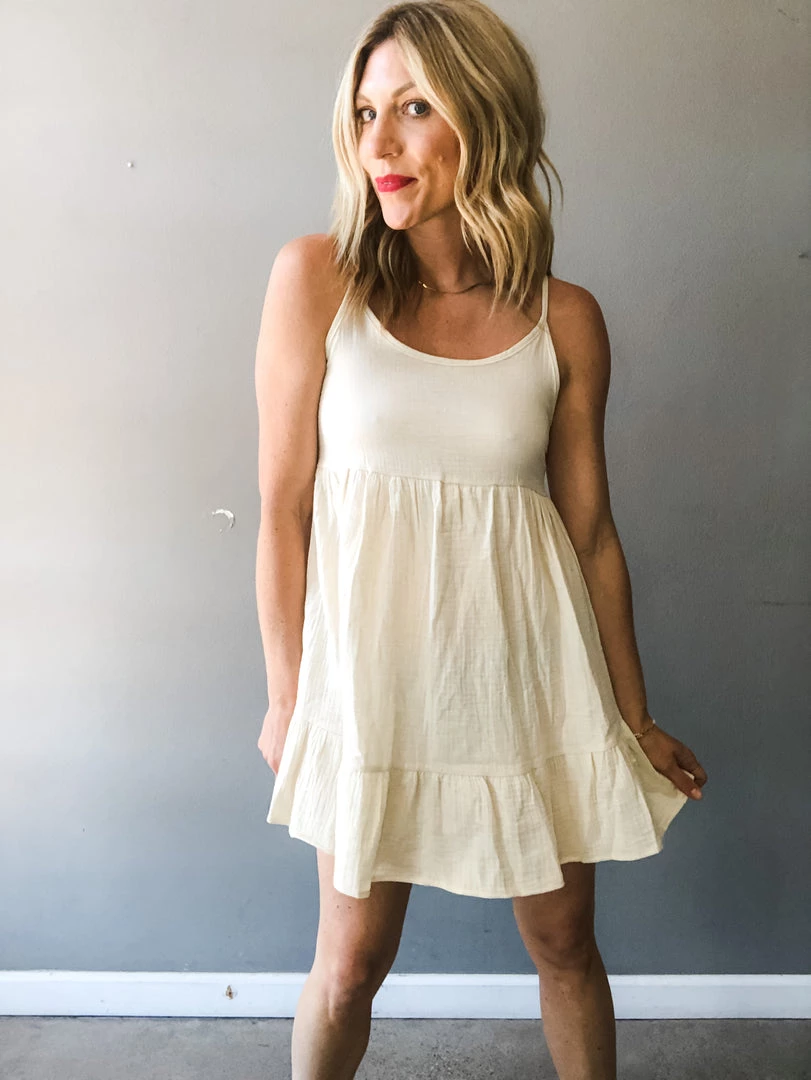 A linen babydoll pull on dress with a fun back cutout and ruffle detail. Toss on with sandals or sneaks or layer over a swimmie on your way to the pool. A great easy dress to toss on and go. Model recommends sizing up for a looser fit.Â