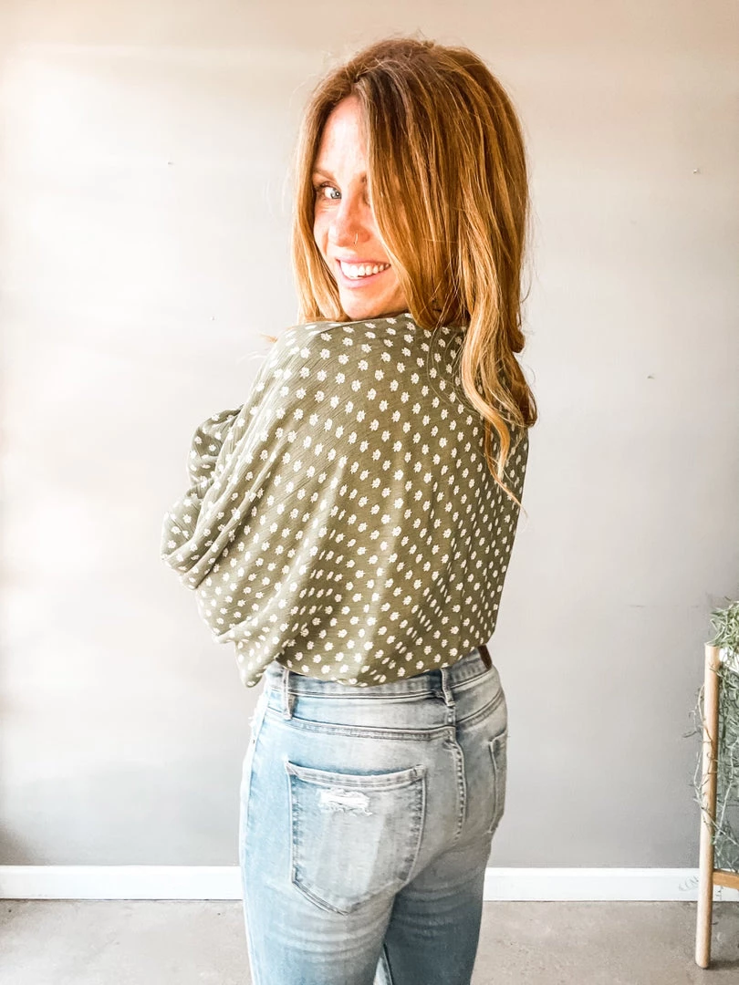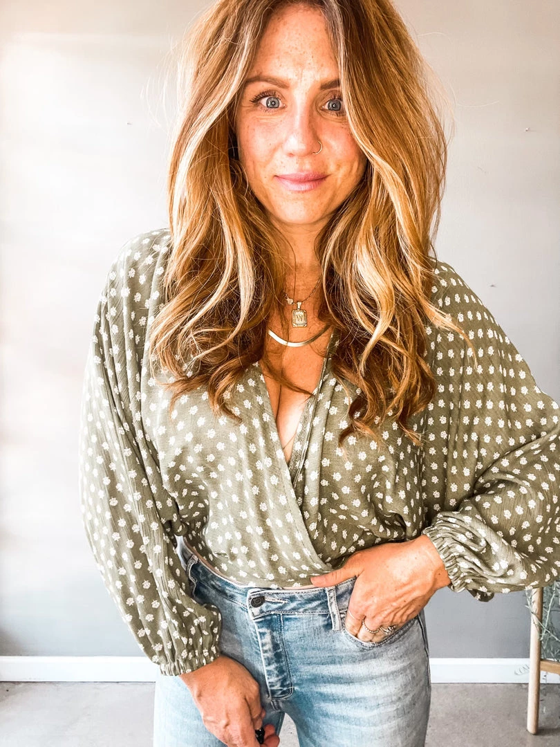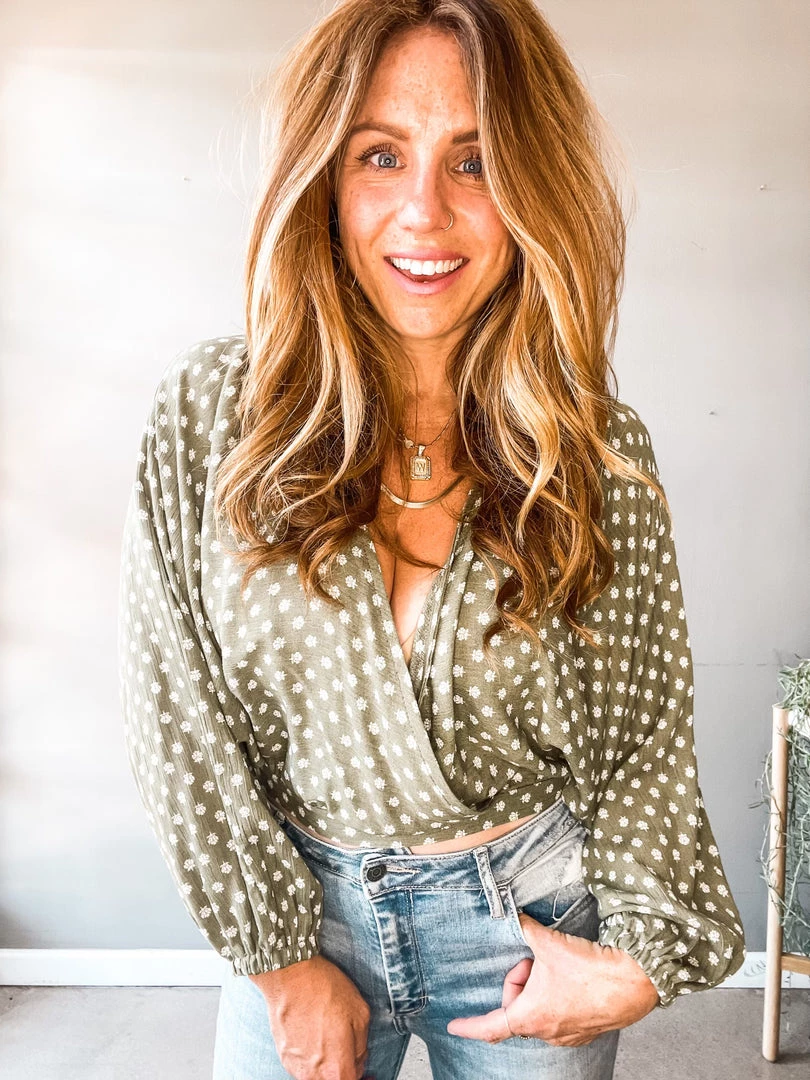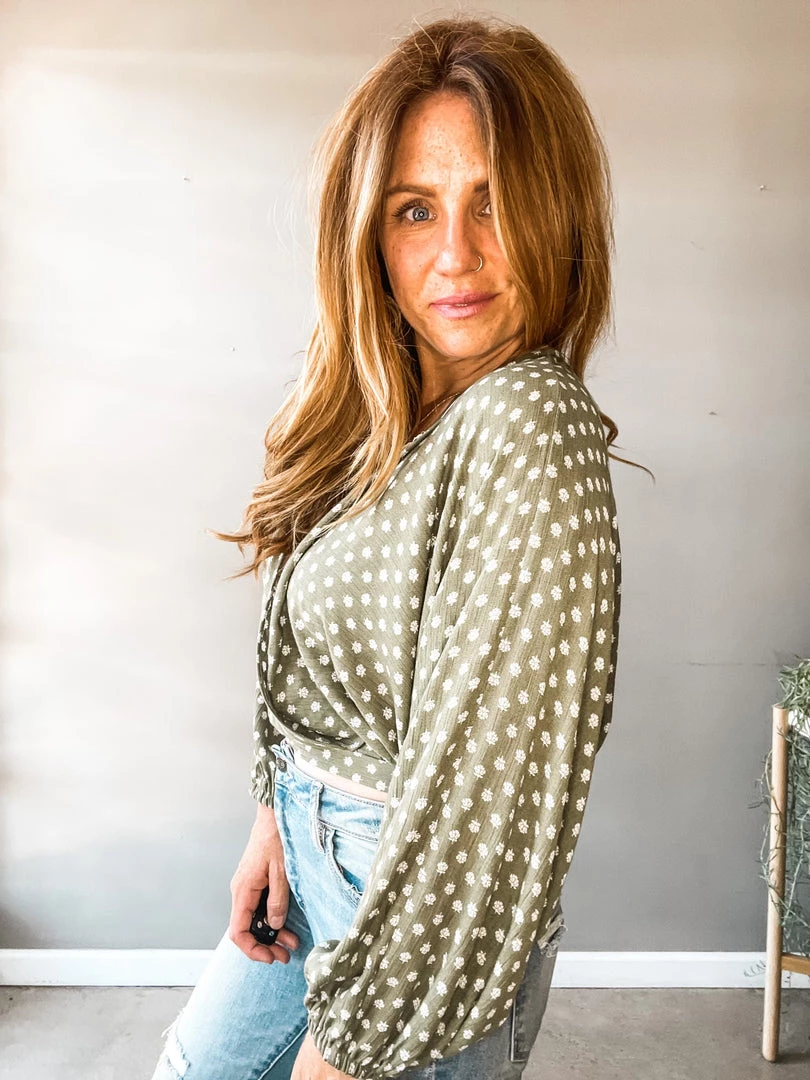 A cropped long sleeve cross-over top we love pairing with denim. This silhouette is easy to toss on and go. Elastic hemline with balloon sleeves that hit at the top of your high waisted denim. Layer over a bralette or cami for a more modest look.