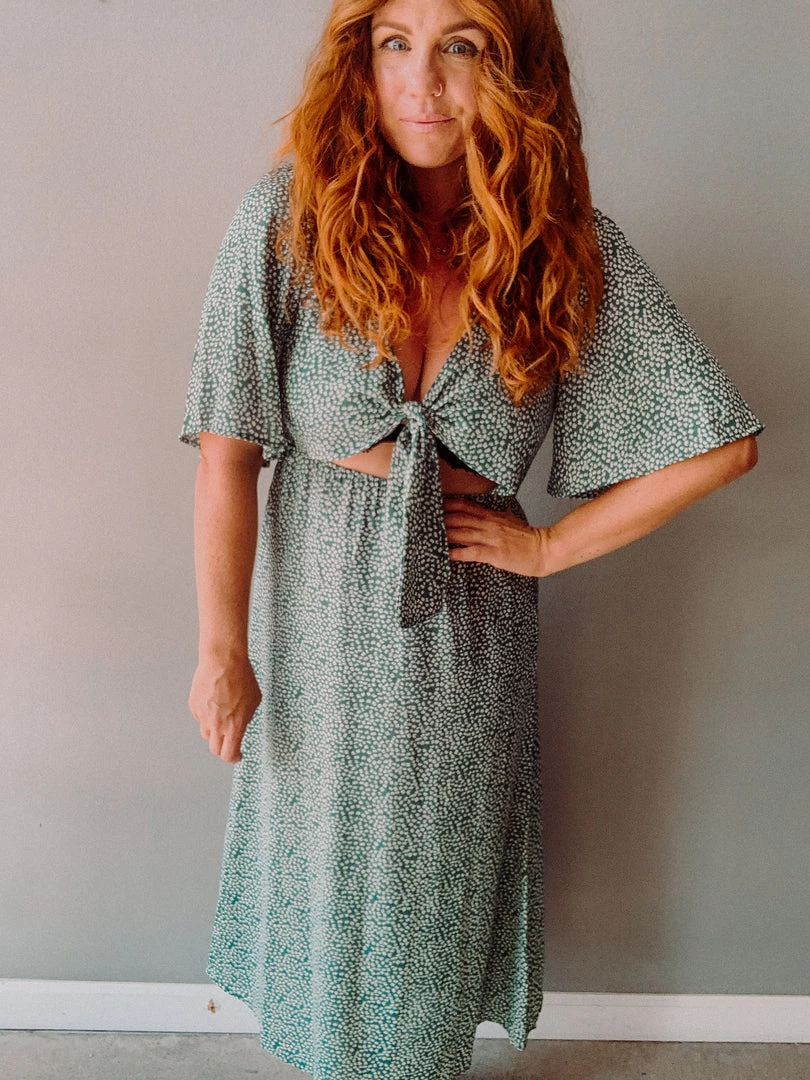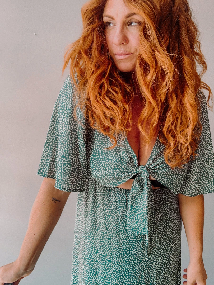 A silhouette favorite of ours, the Scribble Square Maxi has an adjustabel tie bust and peek a boo cutout at the wasitline (waist is elastic so there’s no pinching…super flattering)! This body is always a bestseller!! Mid lenght, flowy sleeves and a looser, flowy skirt, this beautiful emerald dress is a piece you’ll wear again and again!