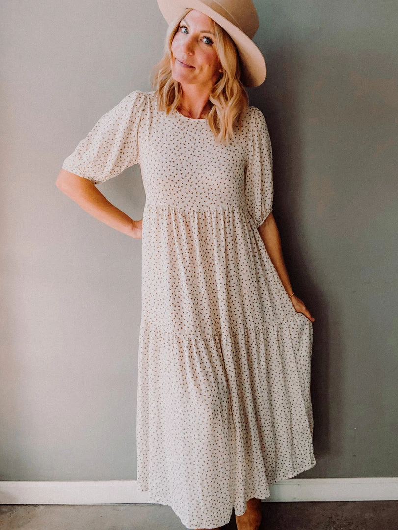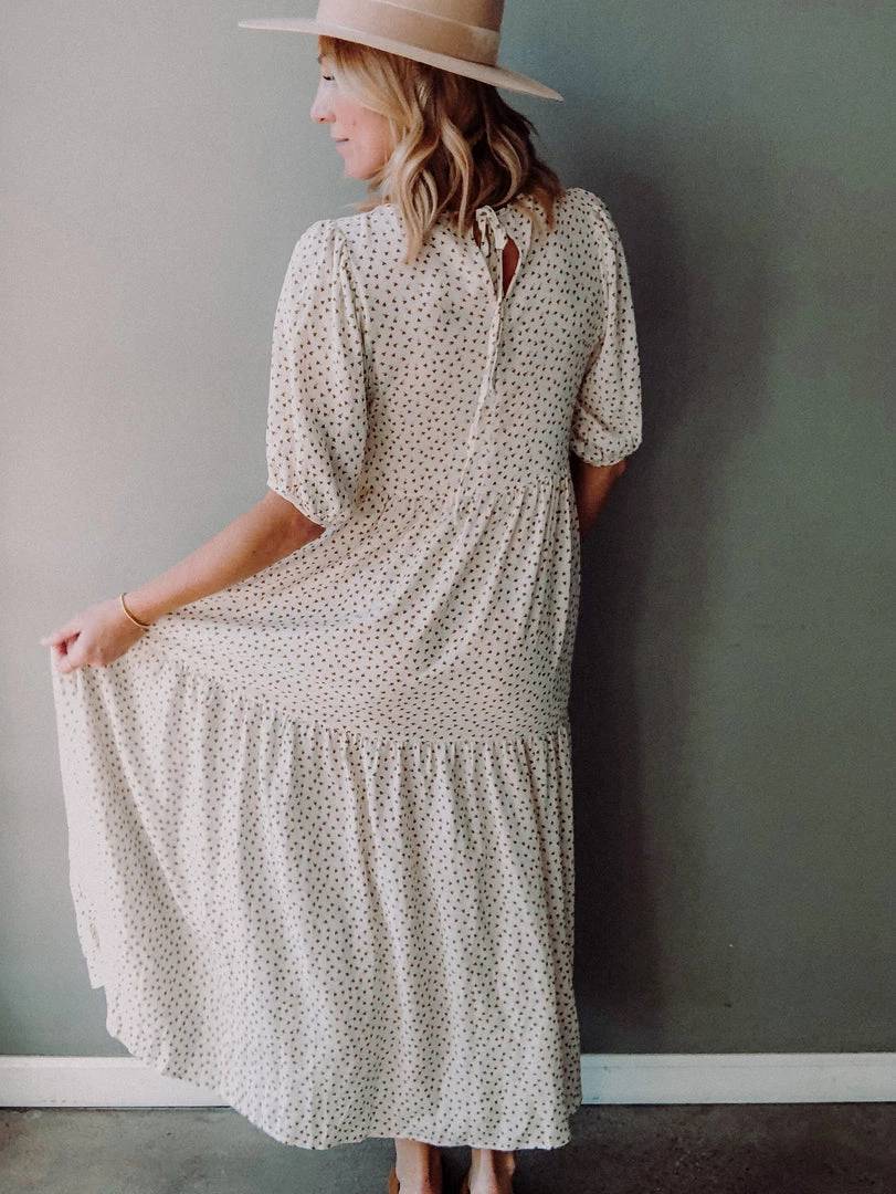 A tiered maxi dress in a tiny floral with balloon sleeves, high neck and tie closure in the back. The Summer in LA Maxi Dress has all the boho feels. Pair with booties and your favorite Lack of Color hat and rock this look for any occasion.