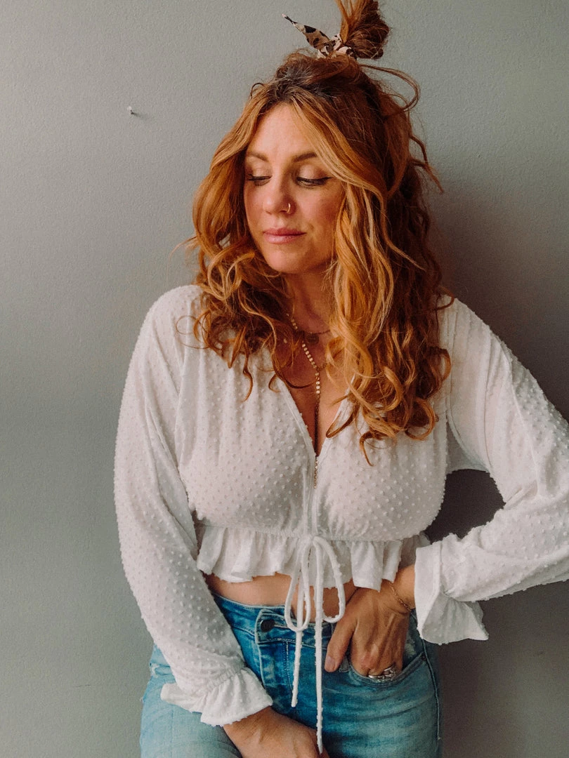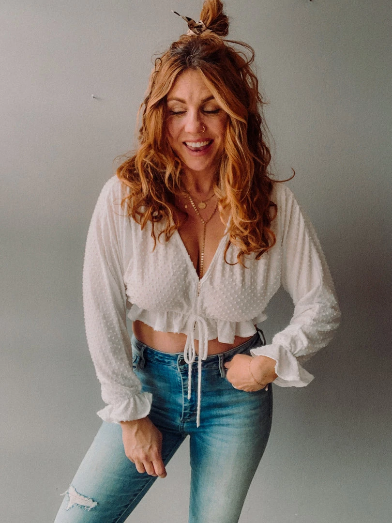 Who’s ready to bare a little belly?! The Swiss Dot Crop is a super soft and sophisticated v neckline crop top with ruffle details and a ruffle hen. We love the dainty clean lines and breezy silhouette of this pretty little top. Definitely on the shorter side and looks great paired with a high rise!!!!