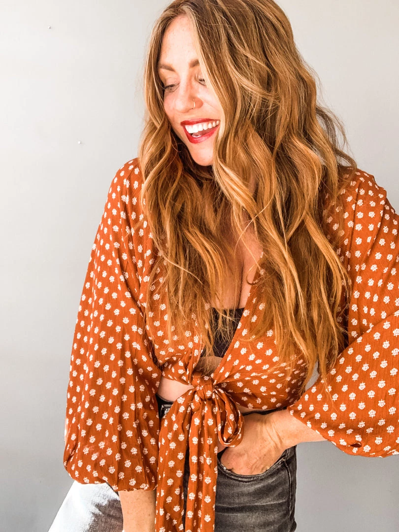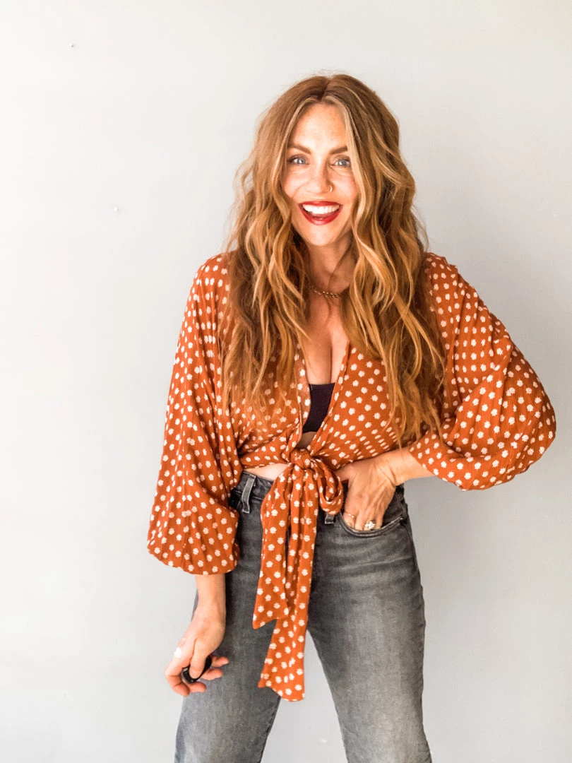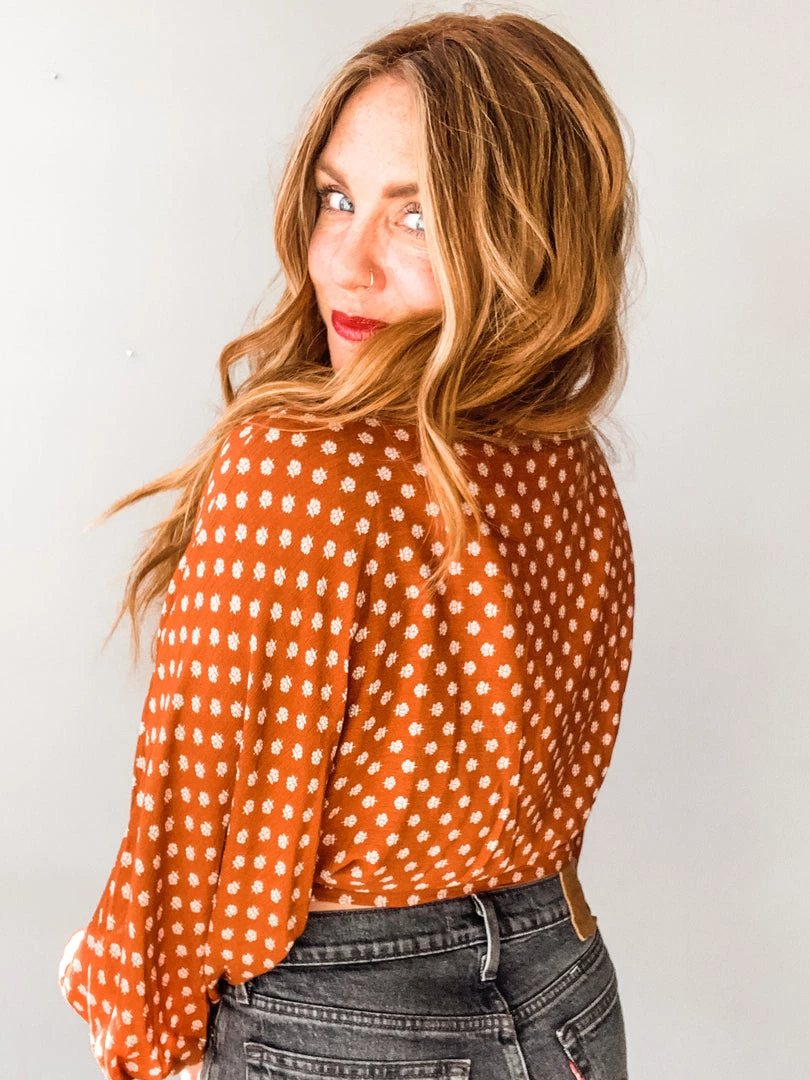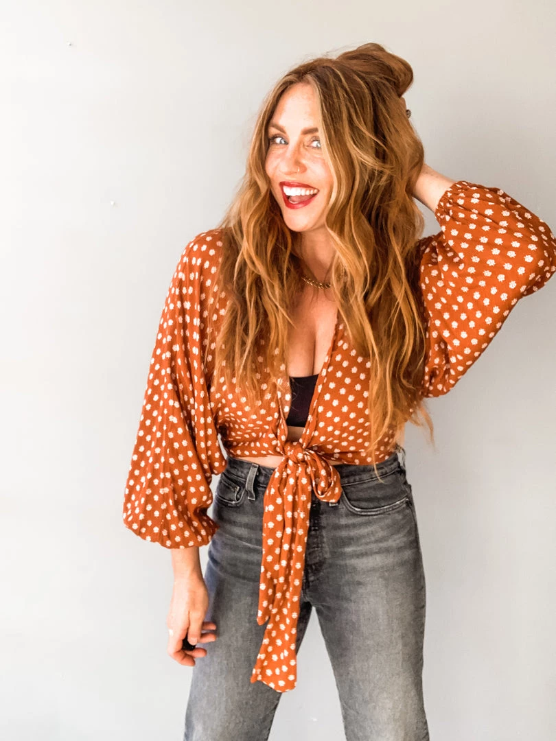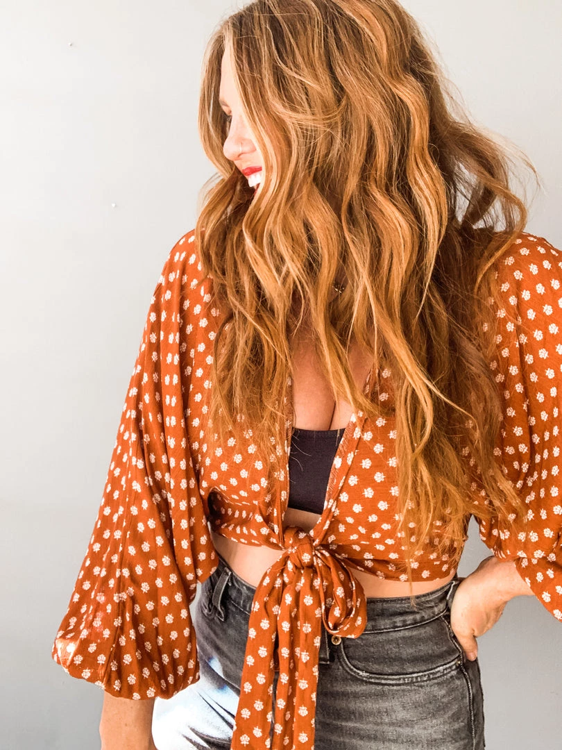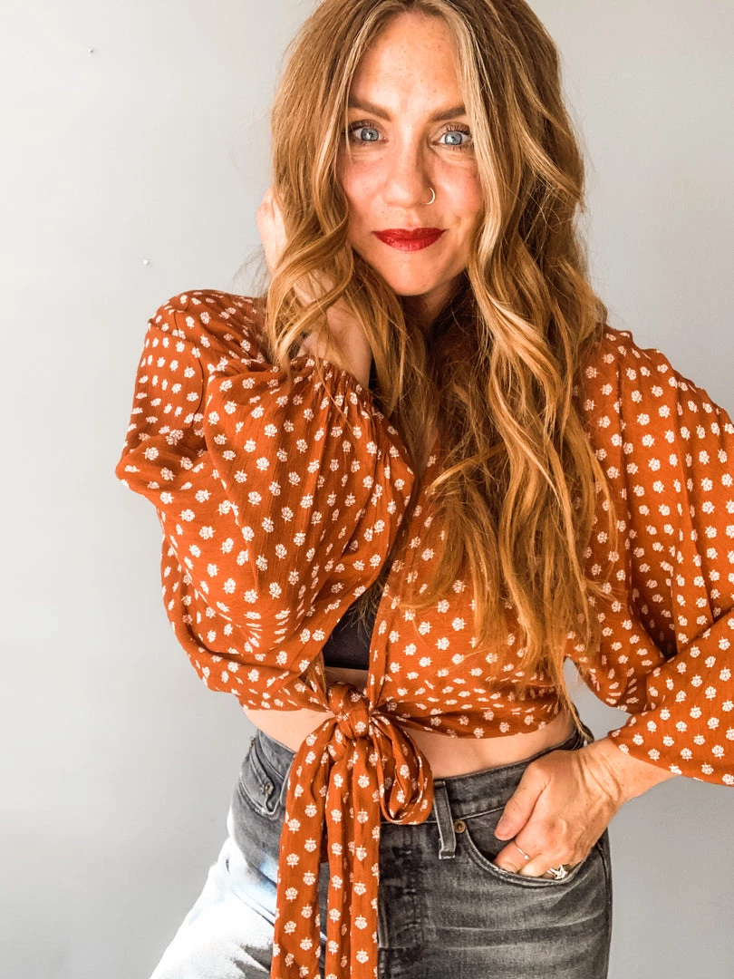 Obsessed with our new Take Me to Brunch Mid Tie Top in a great vintage print. This billowy, balloon sleeved crop is a smidge on the short side, but looks soooooo good with all your high wasited favorites. A center tie at the bustline makes for an easy, boho fit perfect for midis, maxis or denim!