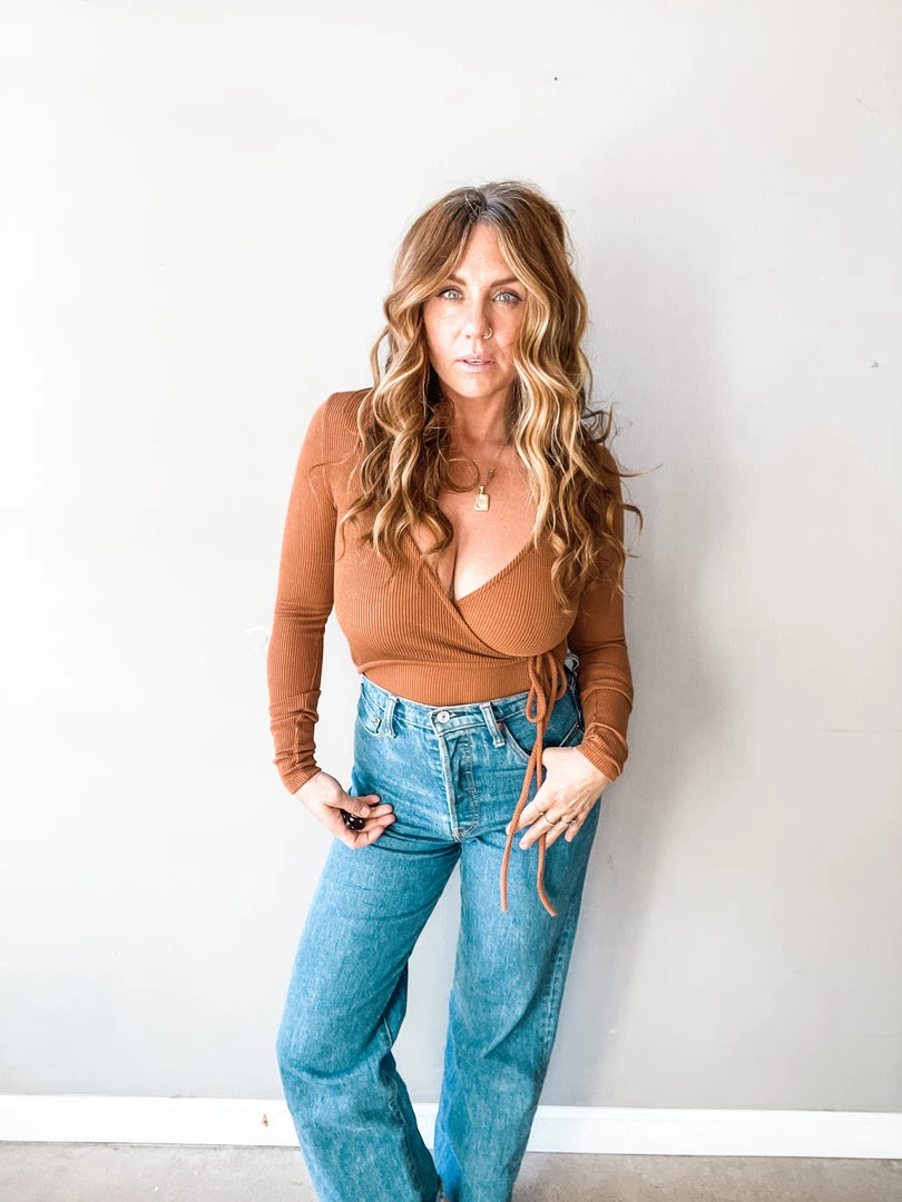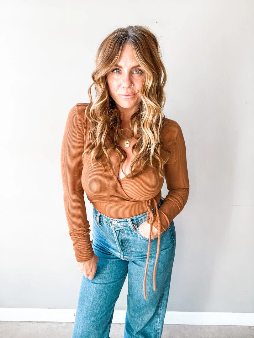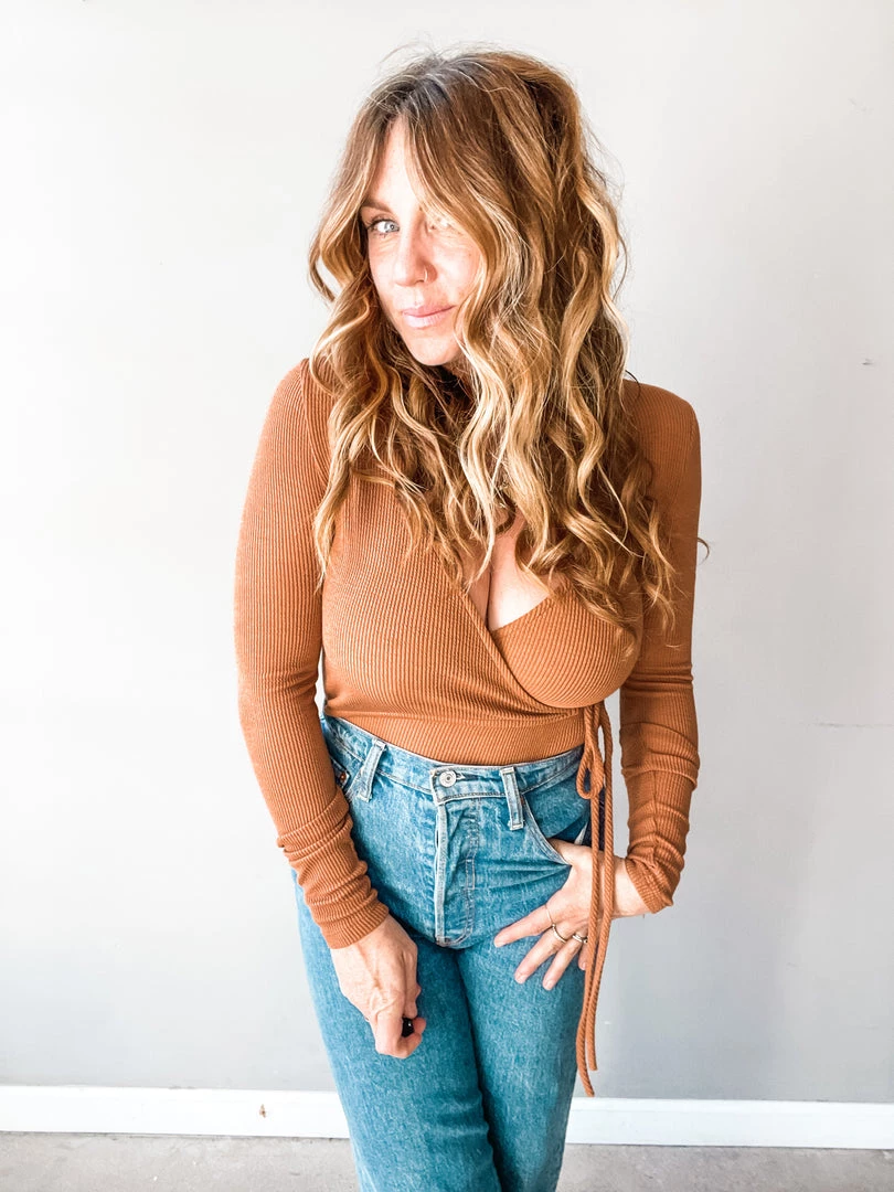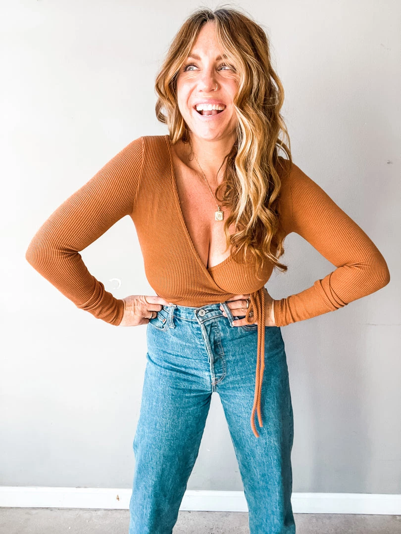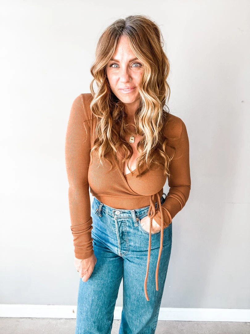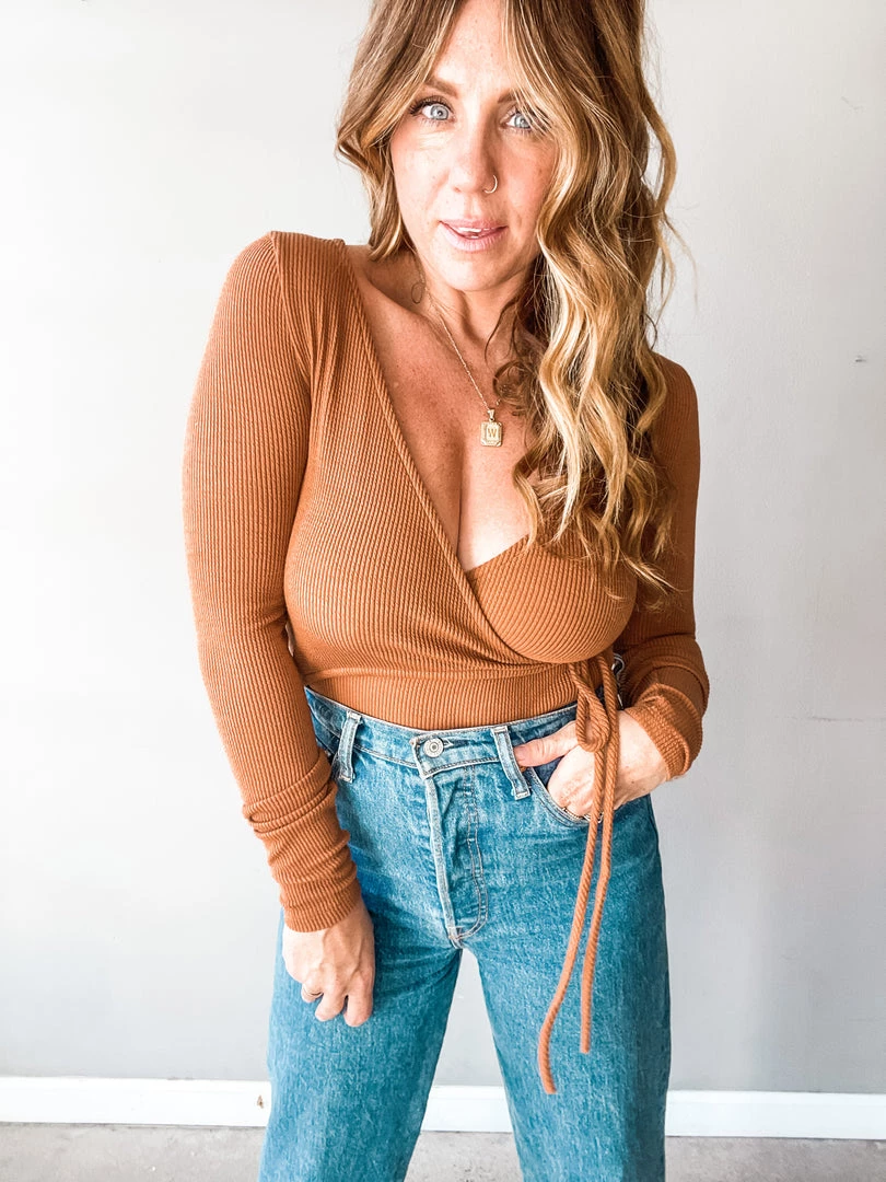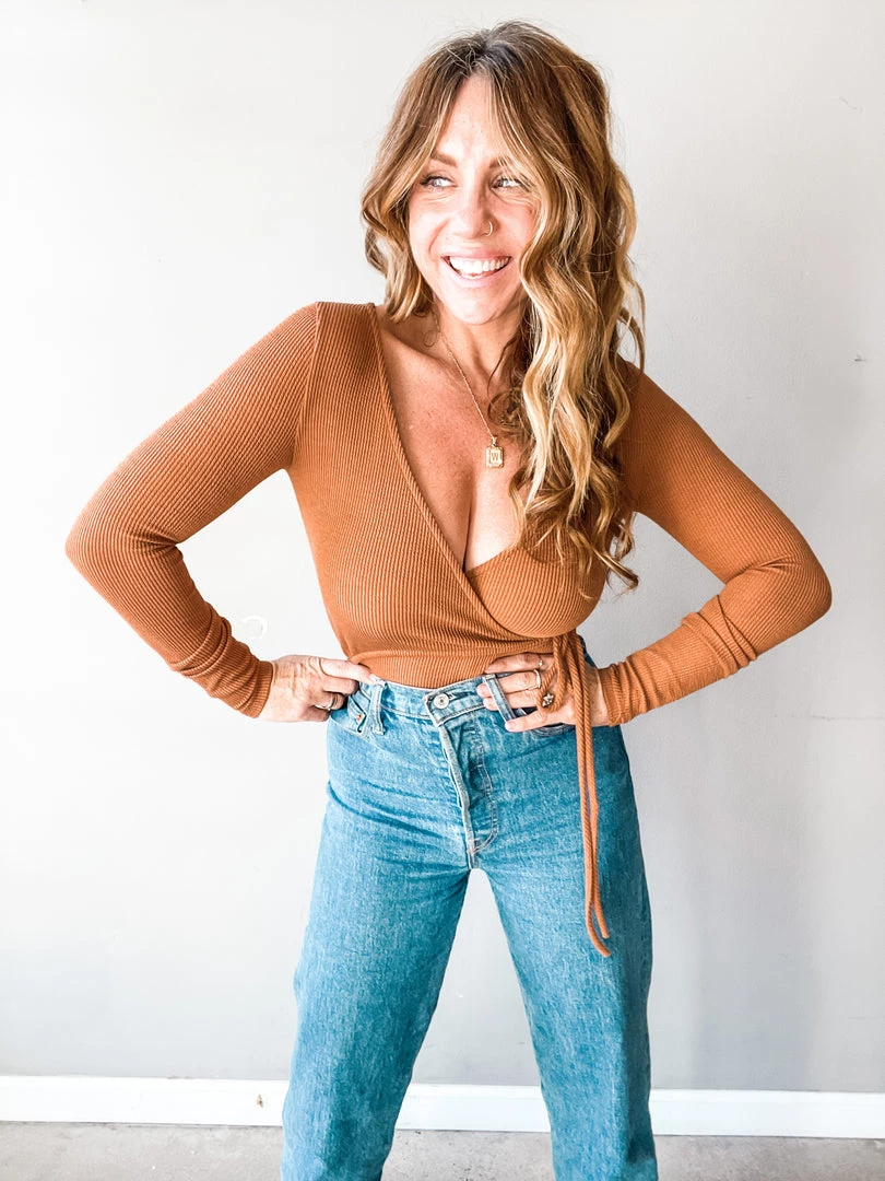 The That’s a Wrap Bodysuit is a mega flattering, deep v neckline bodysuit with a fun side tie detail and long, fitted sleeves. We love this ribbed bodysuit paired under your favorite high waisted denim (that tie and wrap fits at the perfect spot) for a chic and pulled together look that is super effortless!