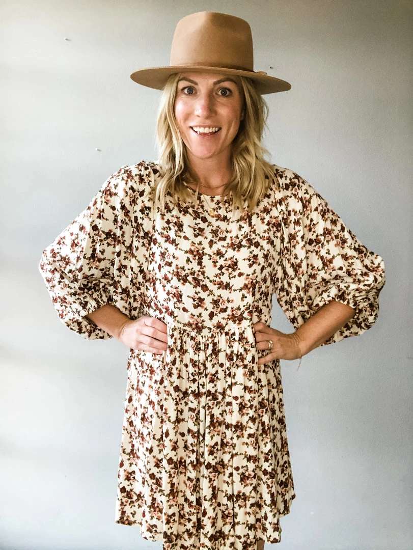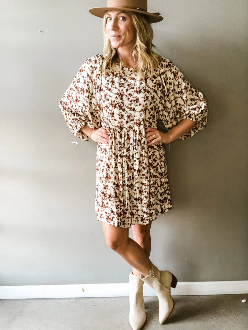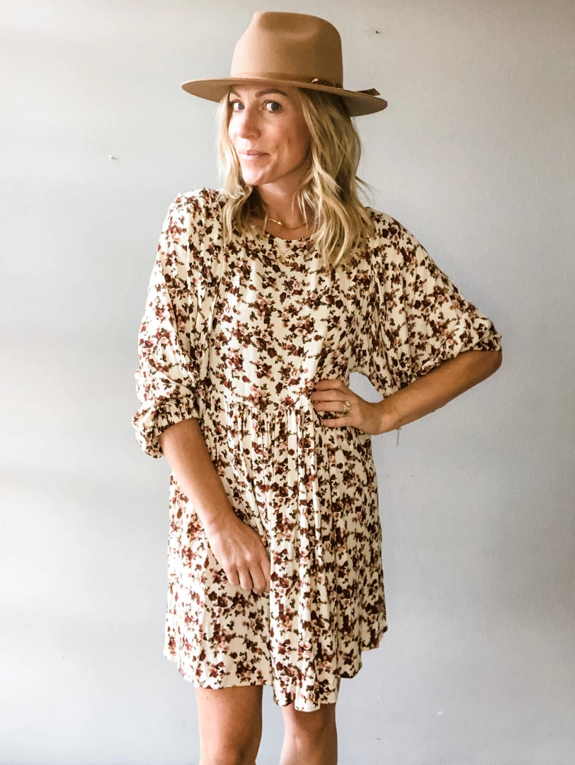 A sweet babydoll in a pinky tone all over floral pattern with balloon sleeves. Easy to pair and wear this floral mini with botties and a hat for fall. Perfect for special occasions are casual with sneakers a perfect addition to any wardrobe.
