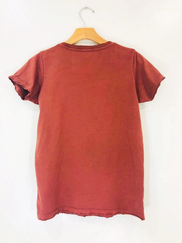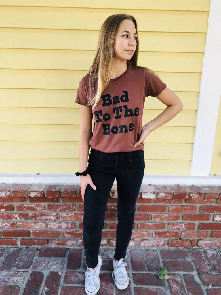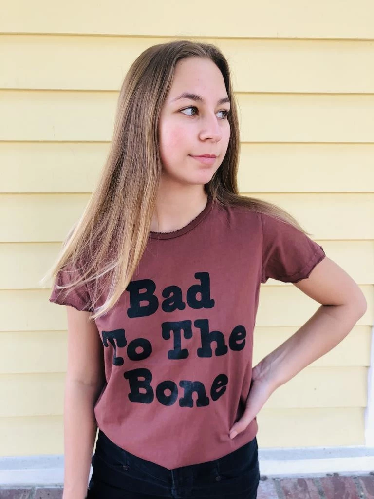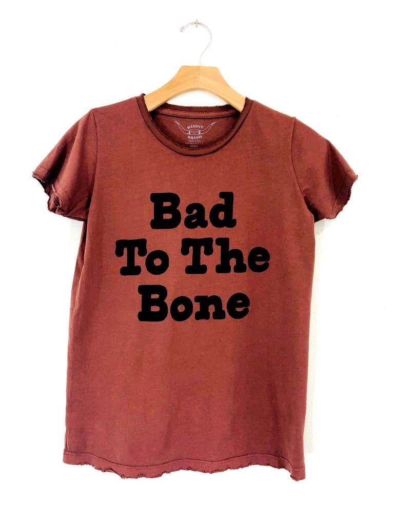 A graphic tee with a worn-in vintage vibe that feels comfy on but looks rad as hell. Bad To The Bone graphic in a washed maroon colorway with raw hem.